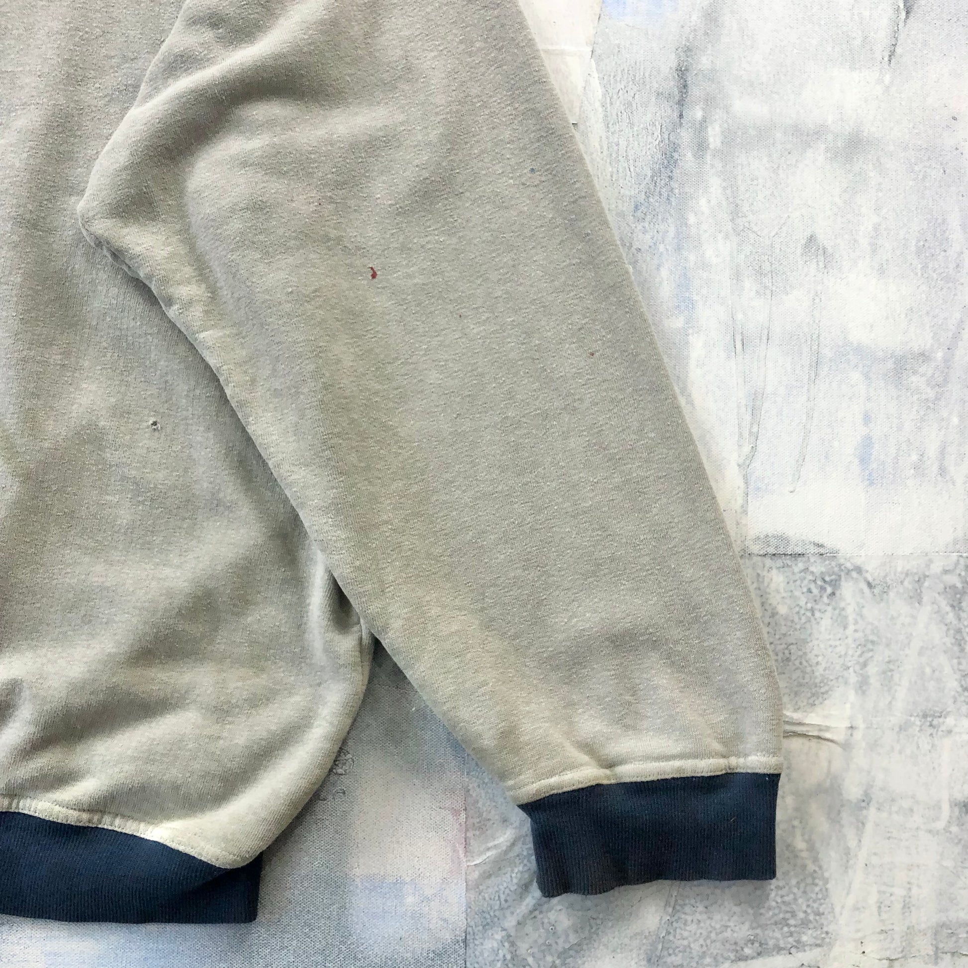 Condition: Few small holes on bottom front side and left sleeve. Small light stains on front and back side. Used in worn condition.