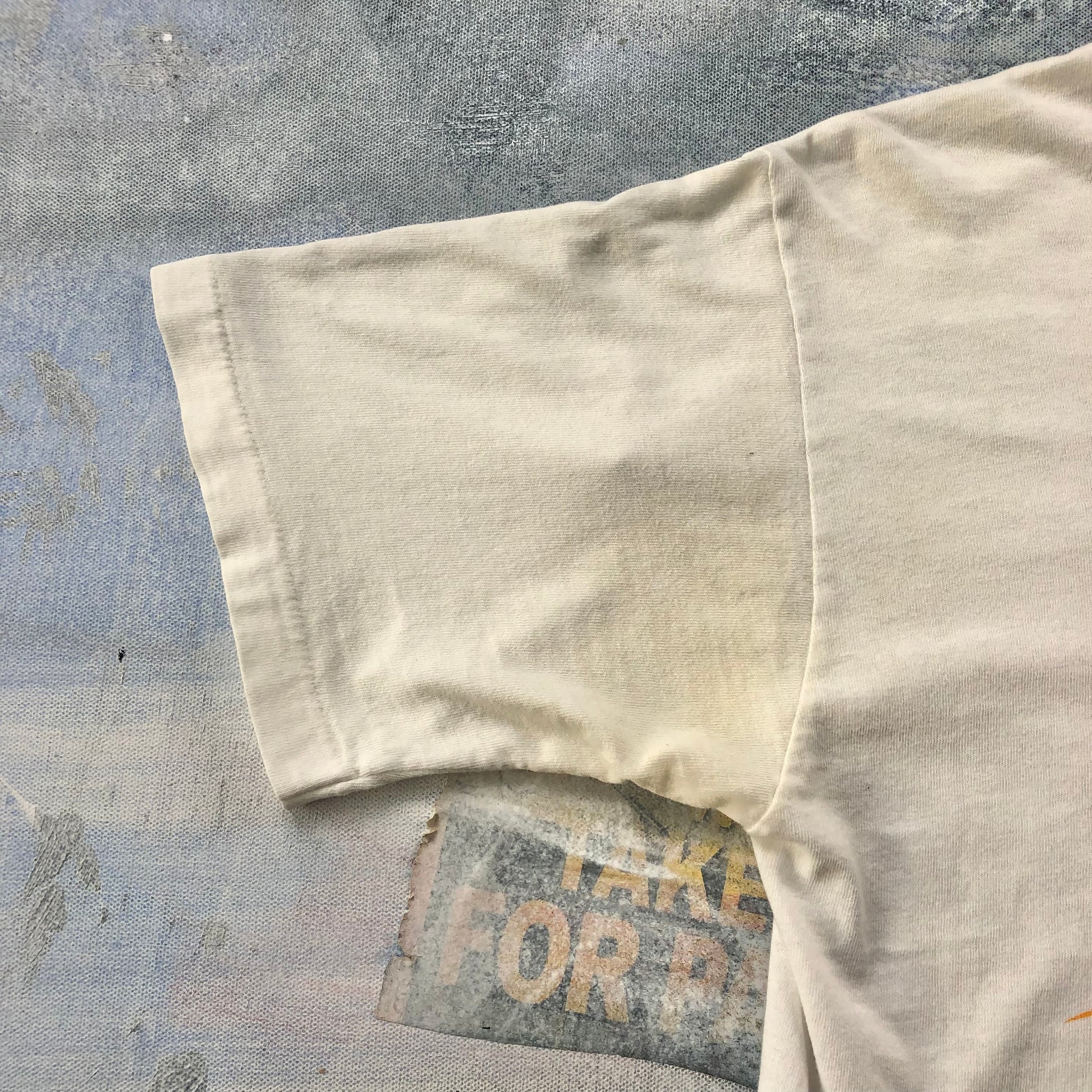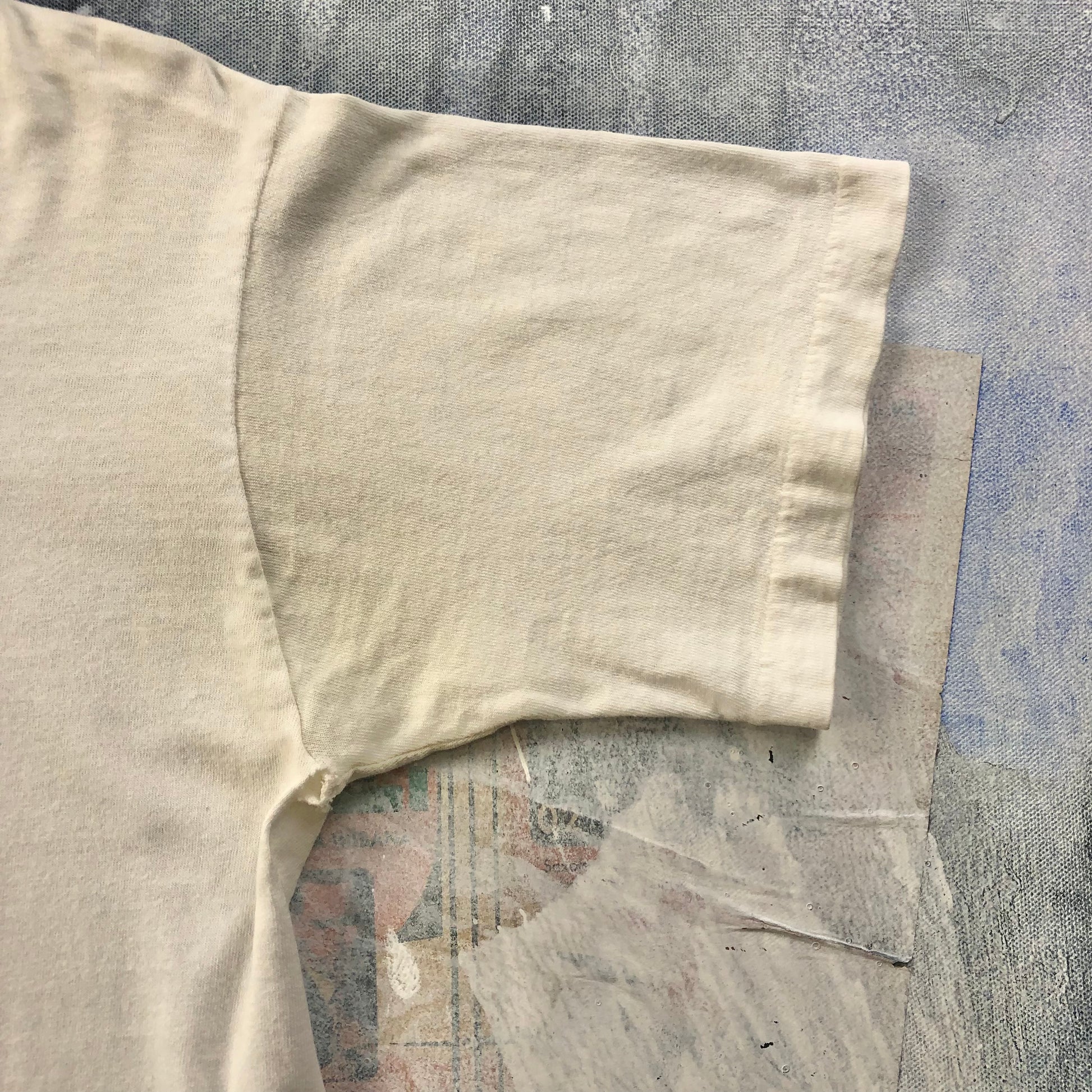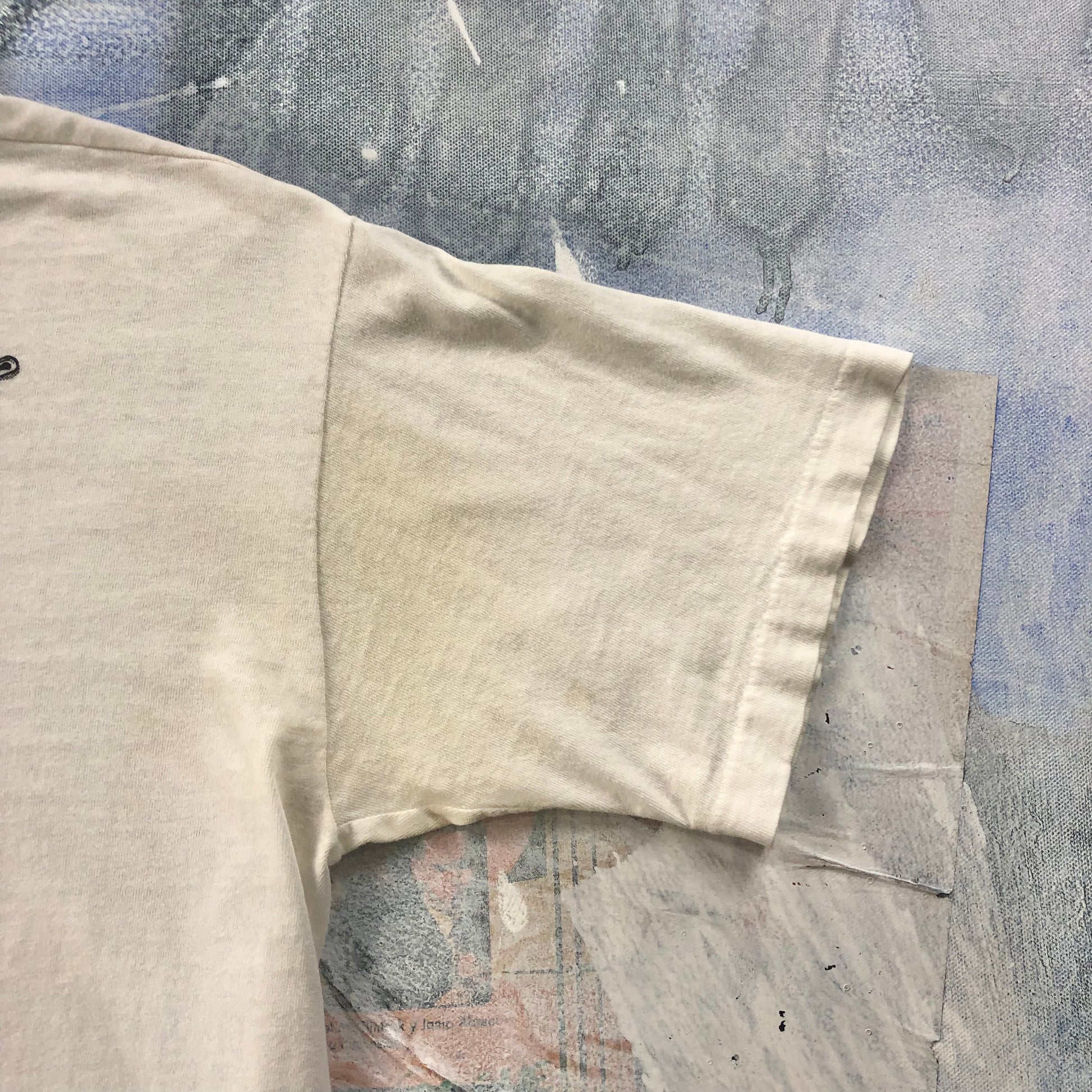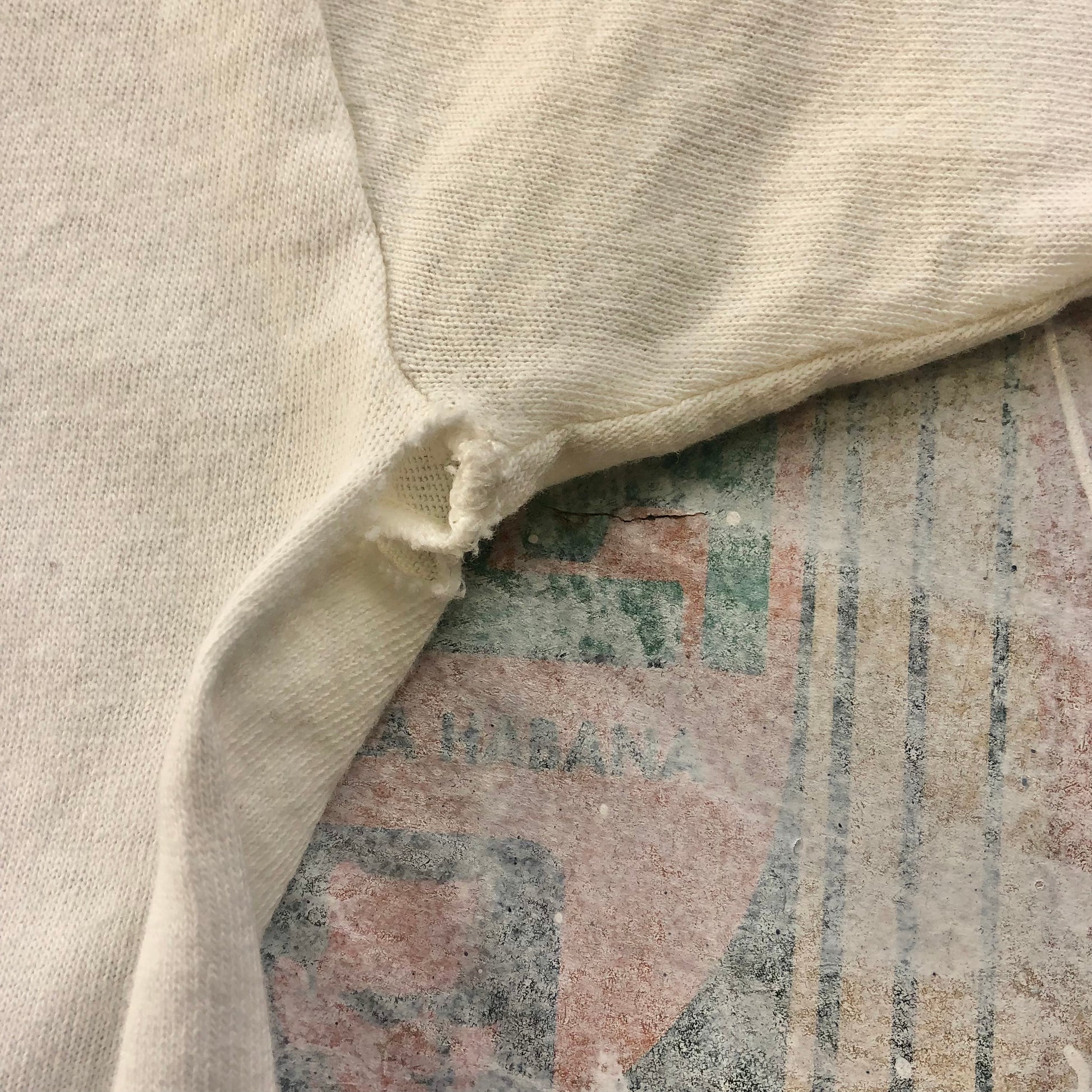 Condition: Distressing on front side. Light yellowing on both armpits. Used in worn condition.