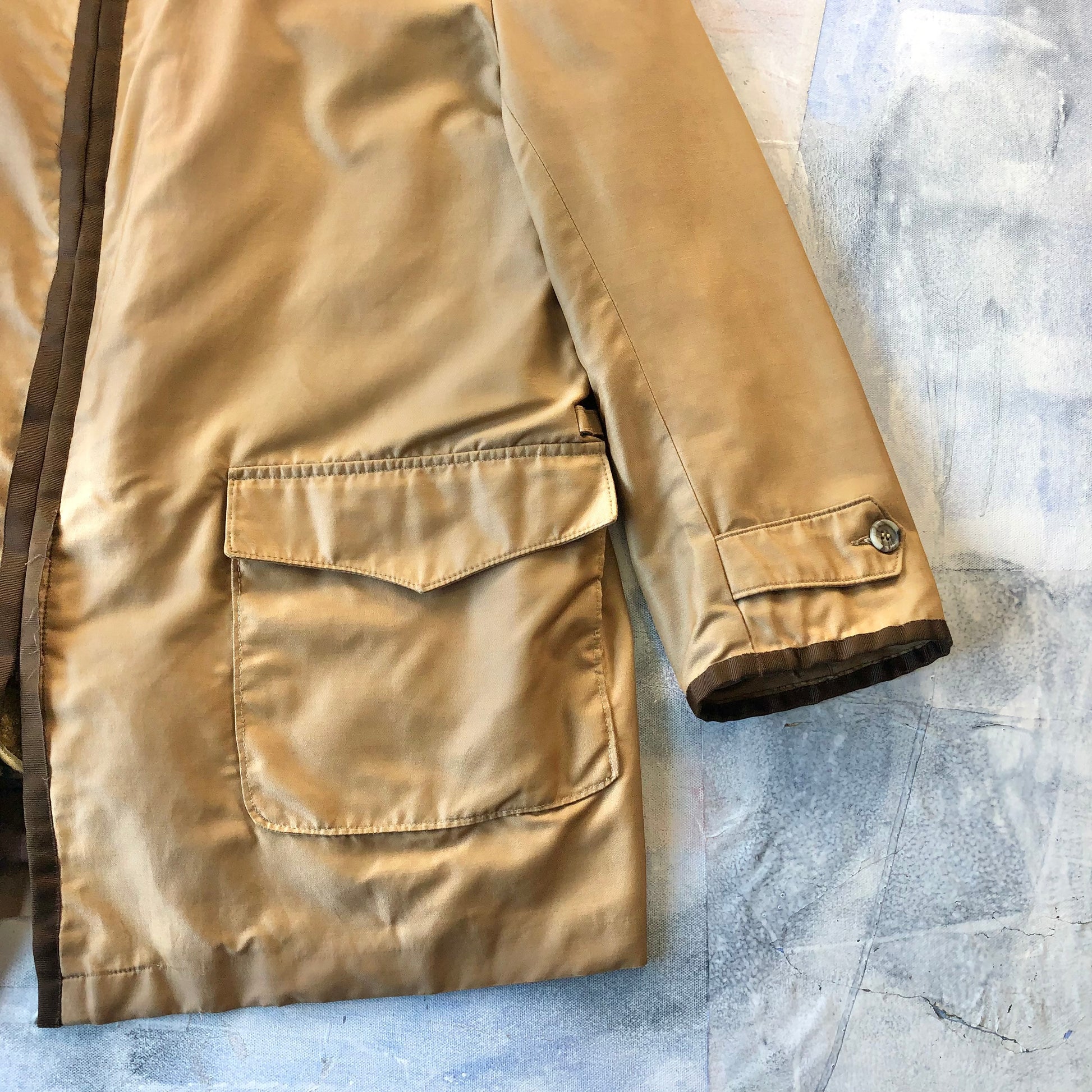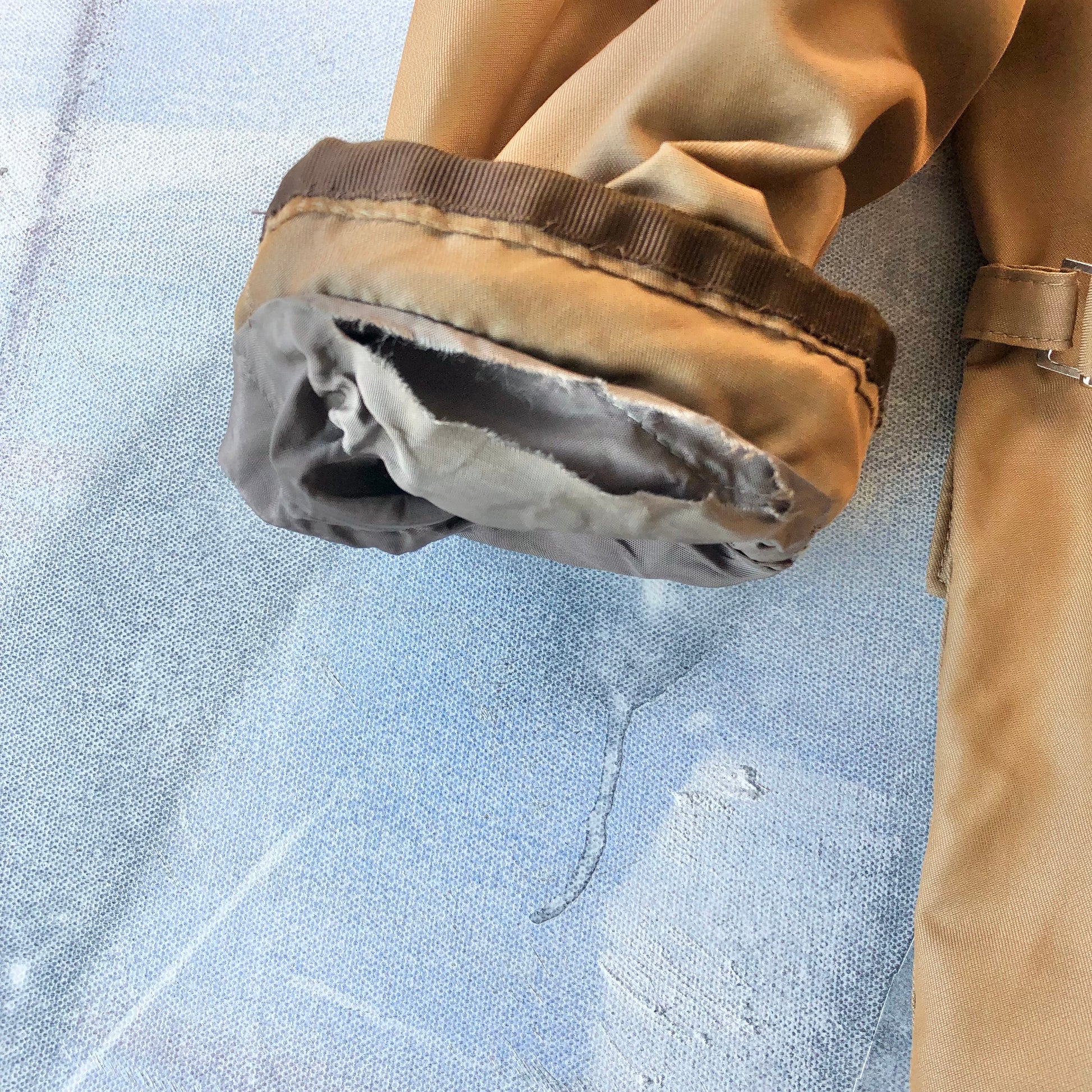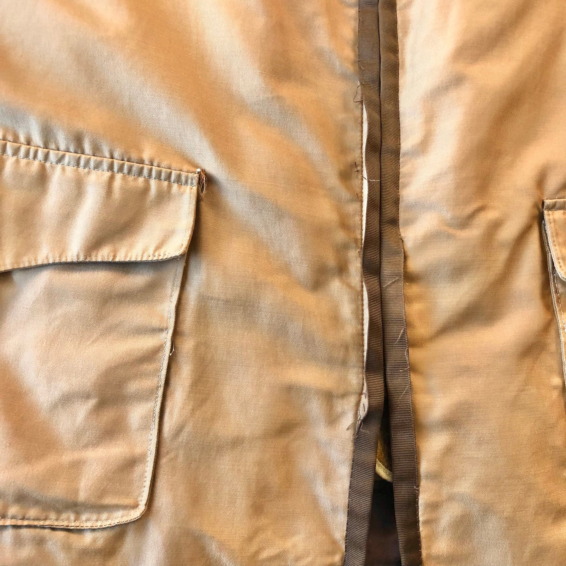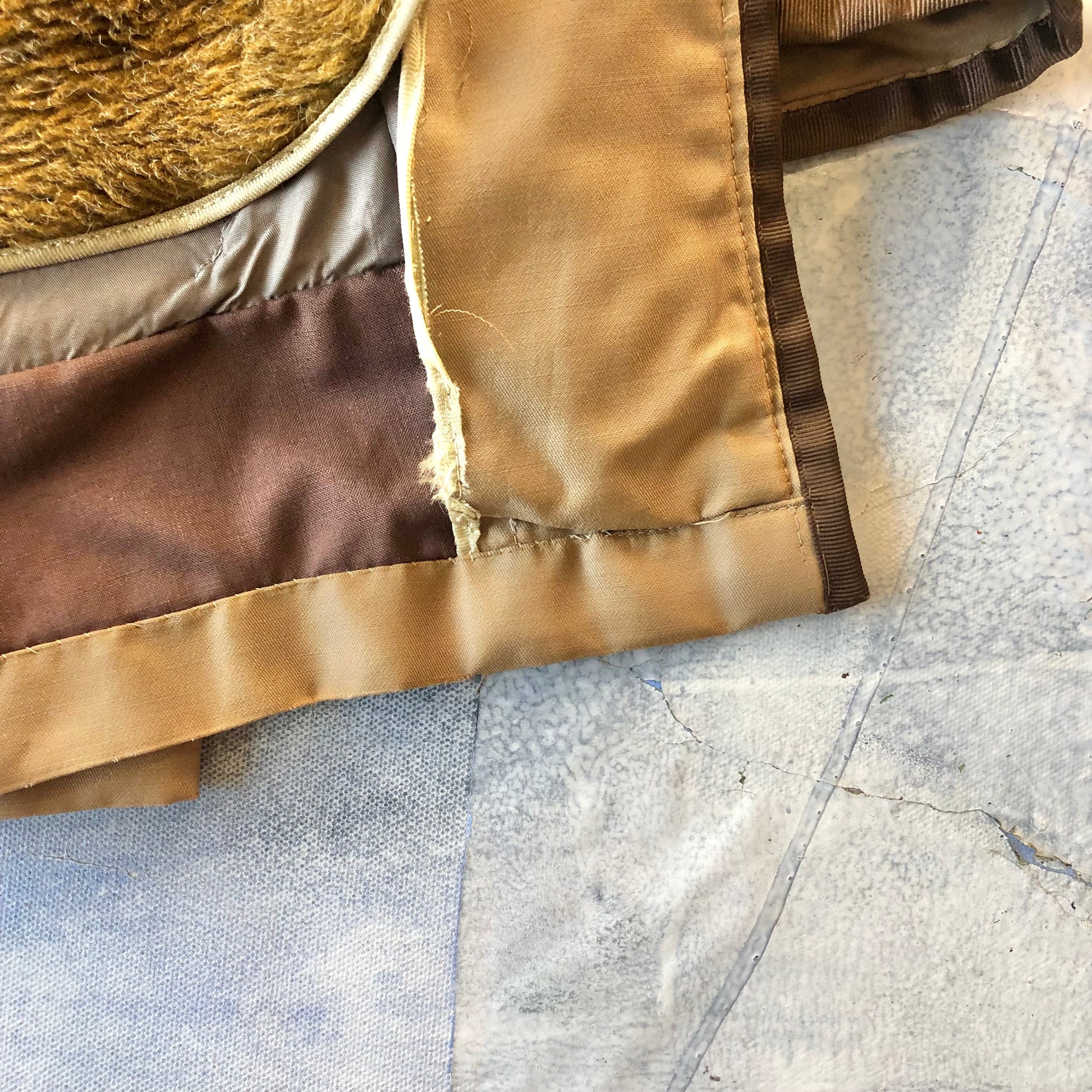 Condition: Some unstitching on front seamline. Small hole on corner front right pocket. Distressing on interior lining of right sleeve. Small hole on hemline. Some light distressing on interior seamlines where the fur lining connects. Used in worn condition.