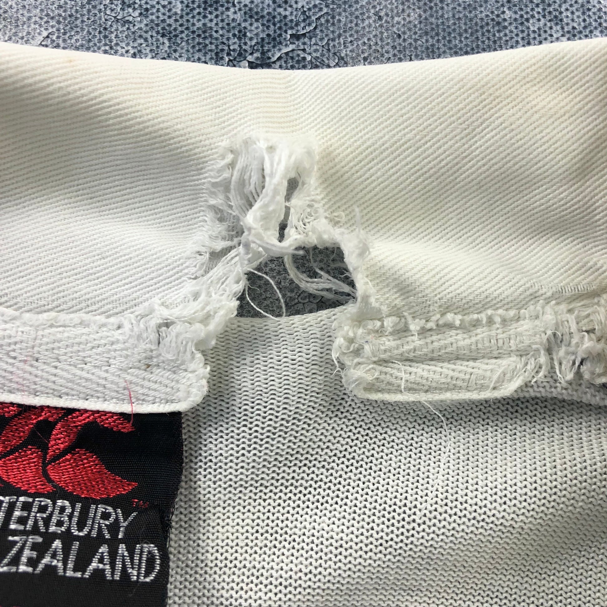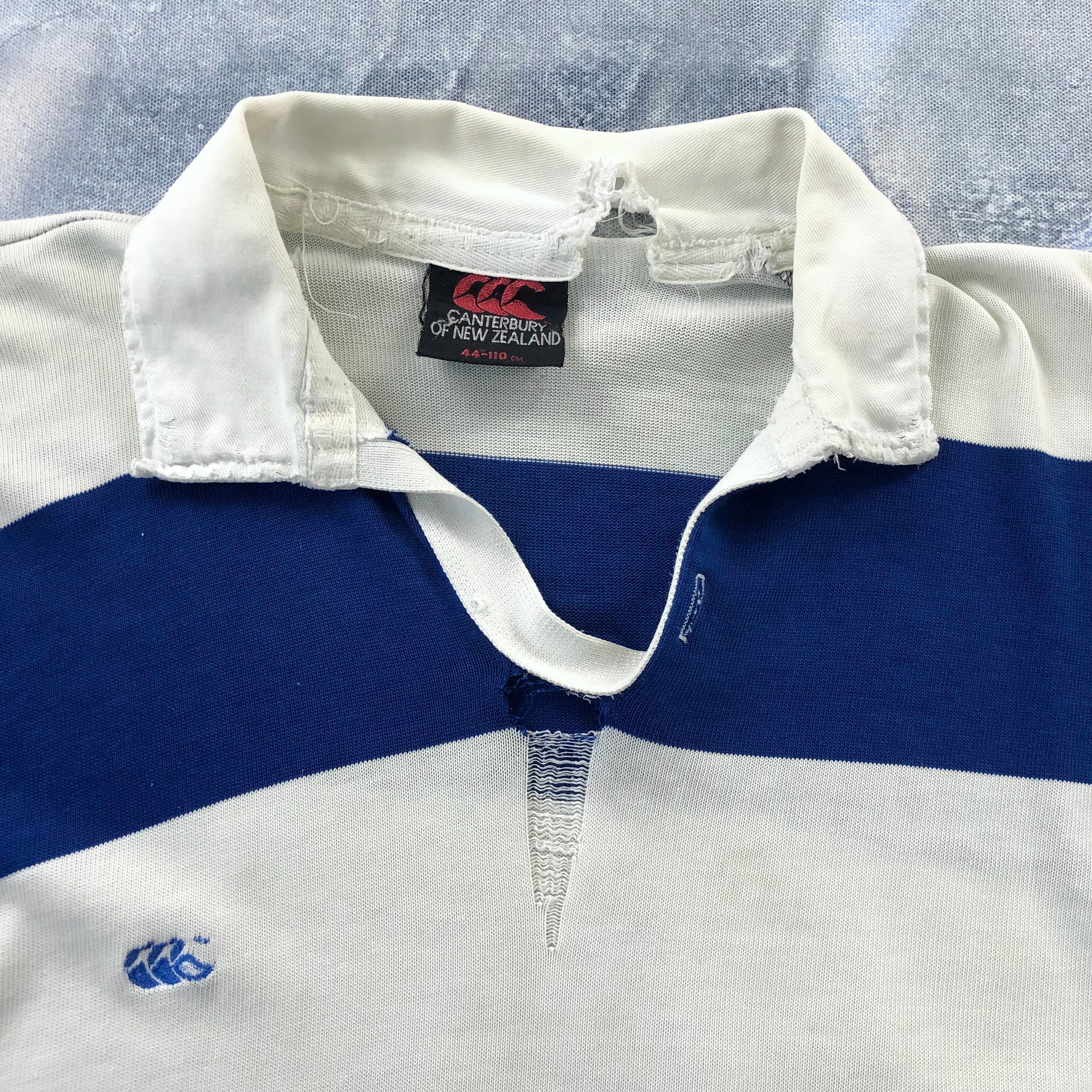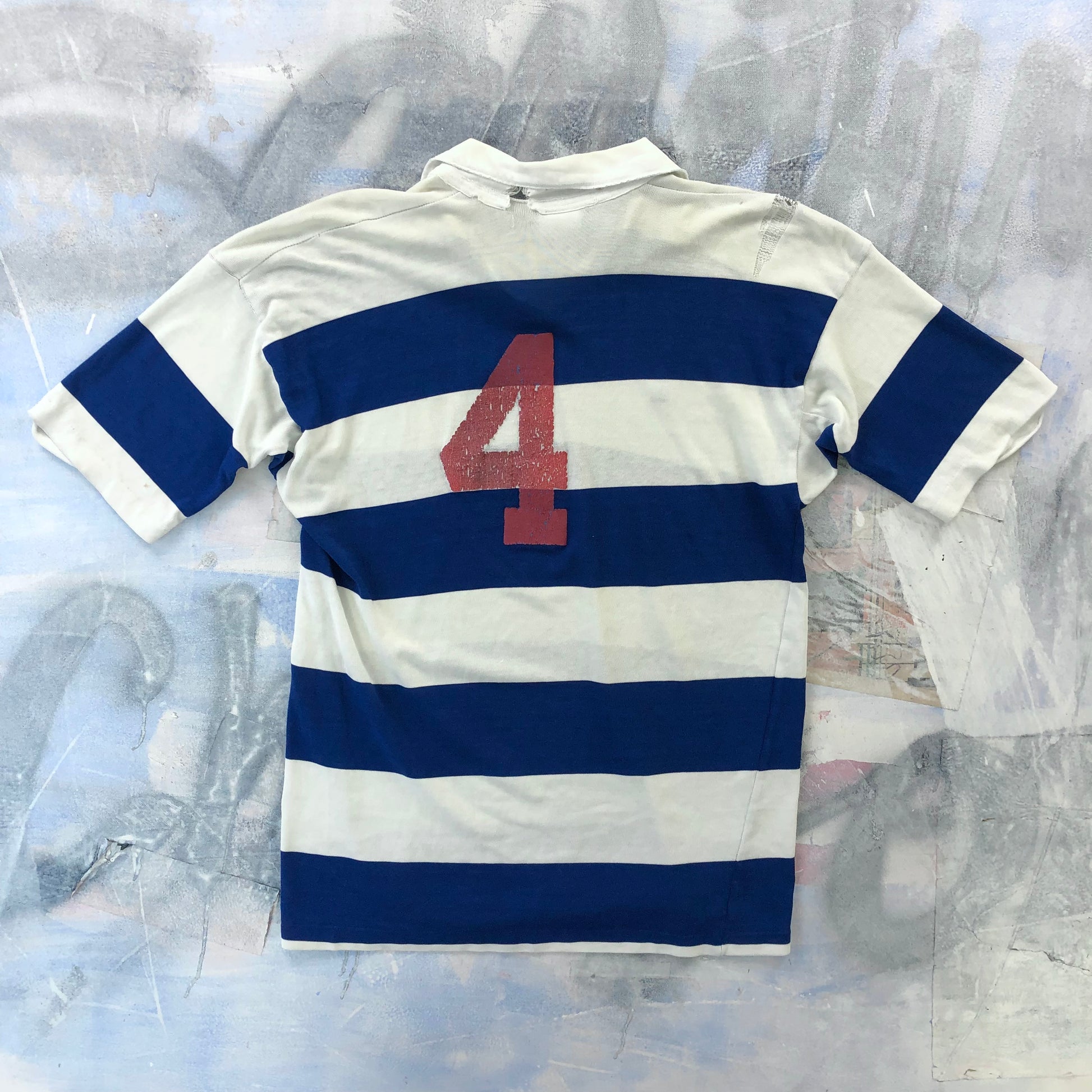 Condition: Some light stains on front side. Some distressing on front collar, chest and back left shoulder. Some unstitching on both sleeves and hemline. Missing front collar button. Used in worn condition.