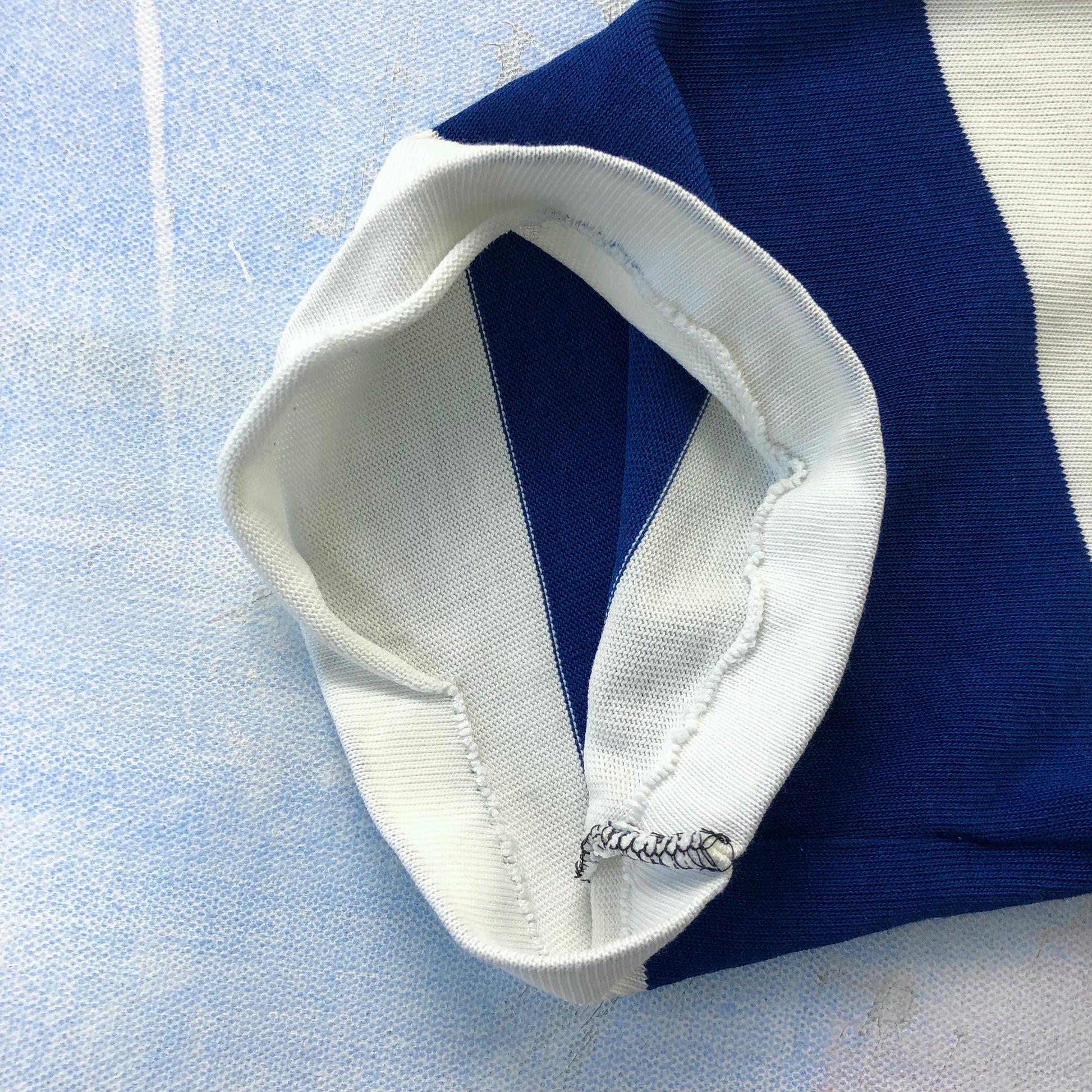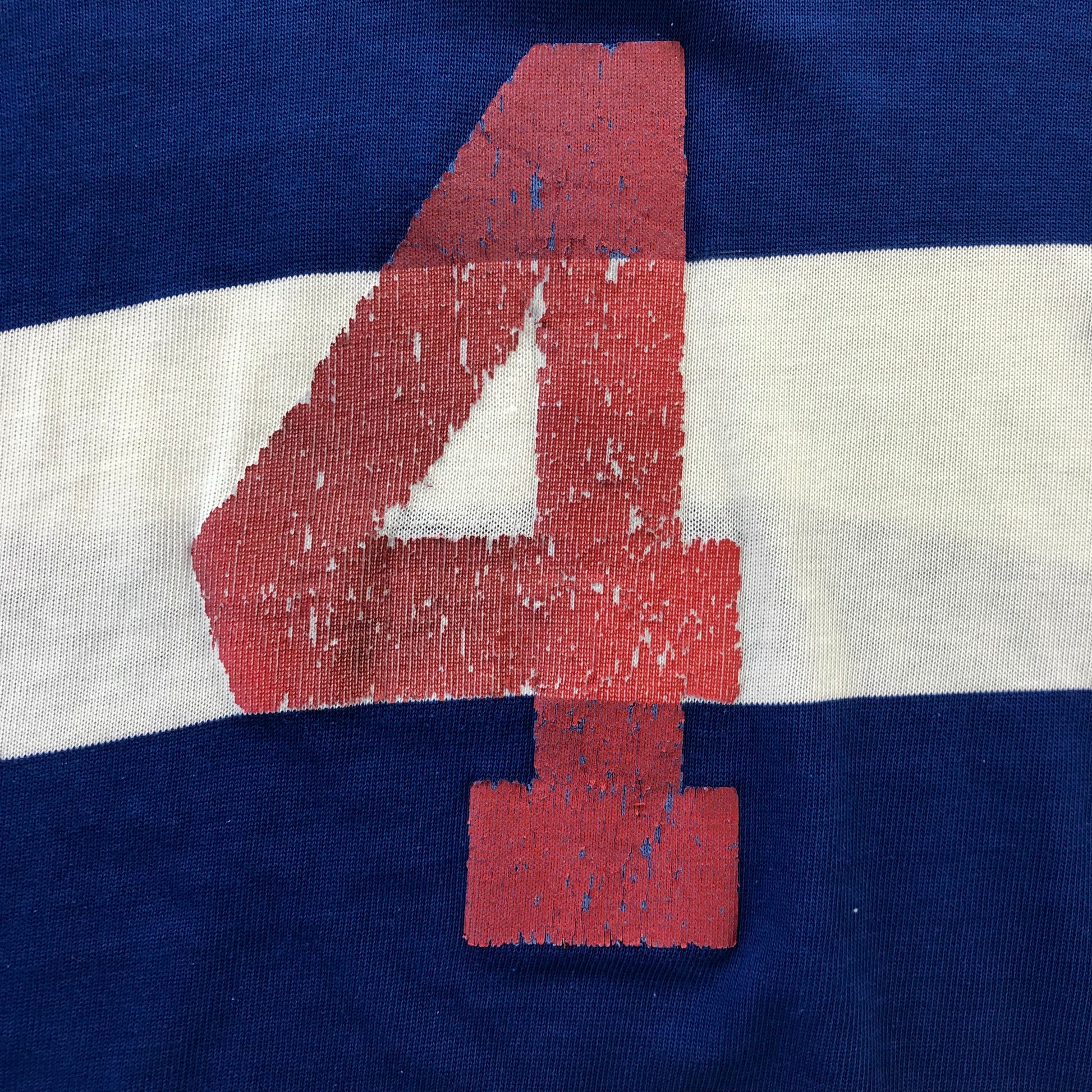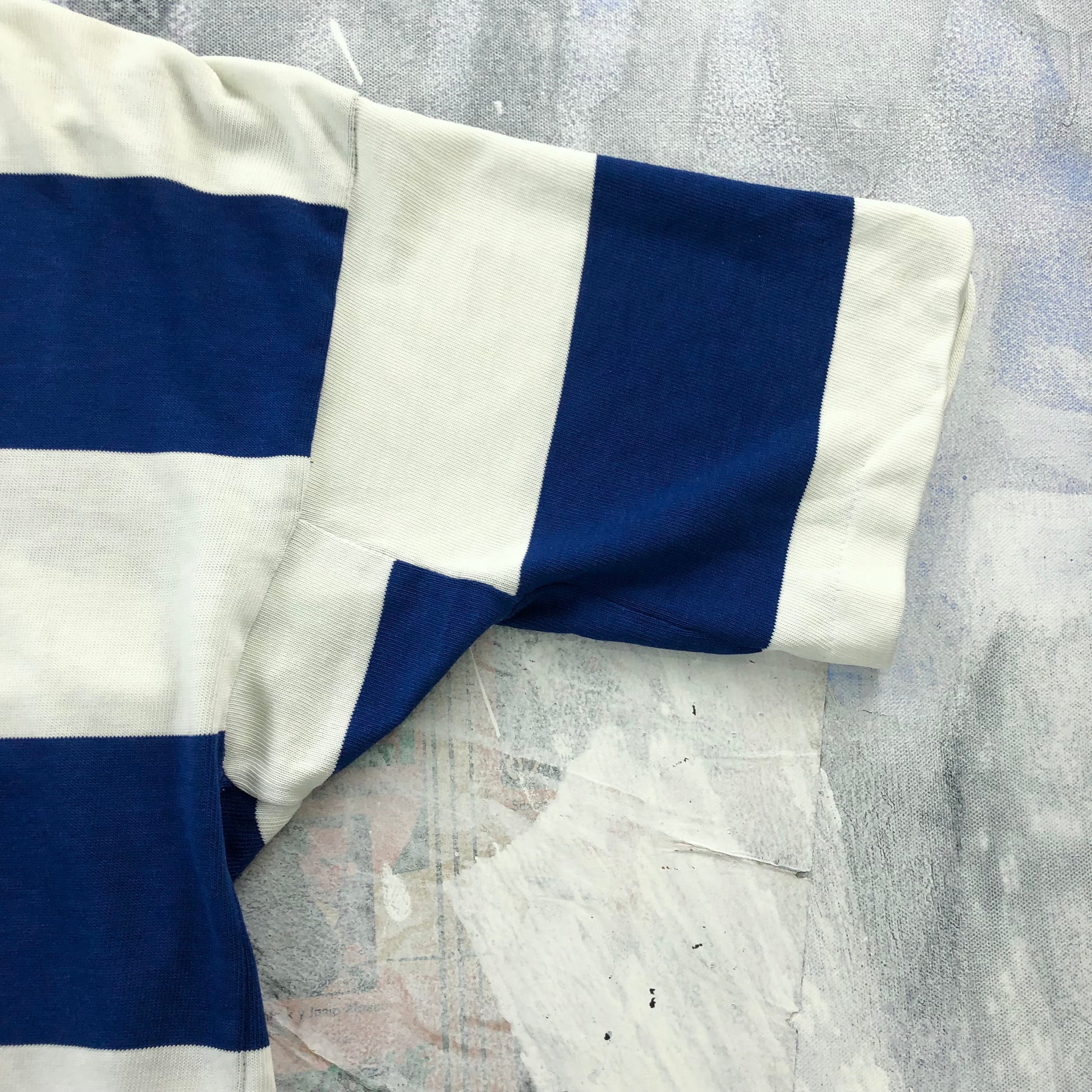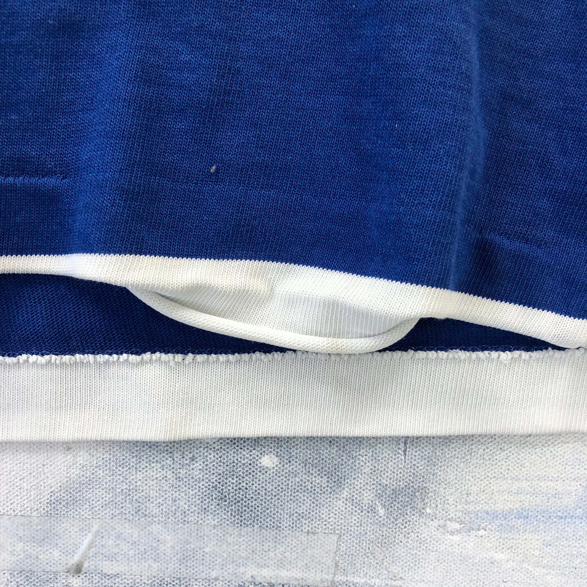 Condition: Some light stains on front side. Some distressing on front collar, chest and back left shoulder. Some unstitching on both sleeves and hemline. Missing front collar button. Used in worn condition.