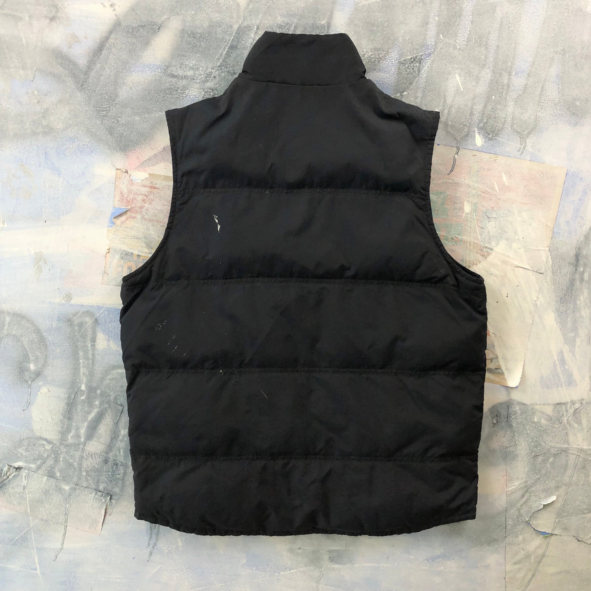Condition: Paint stains on front and back side. Front logo distressed. Zipper broken. Used in worn condition.
