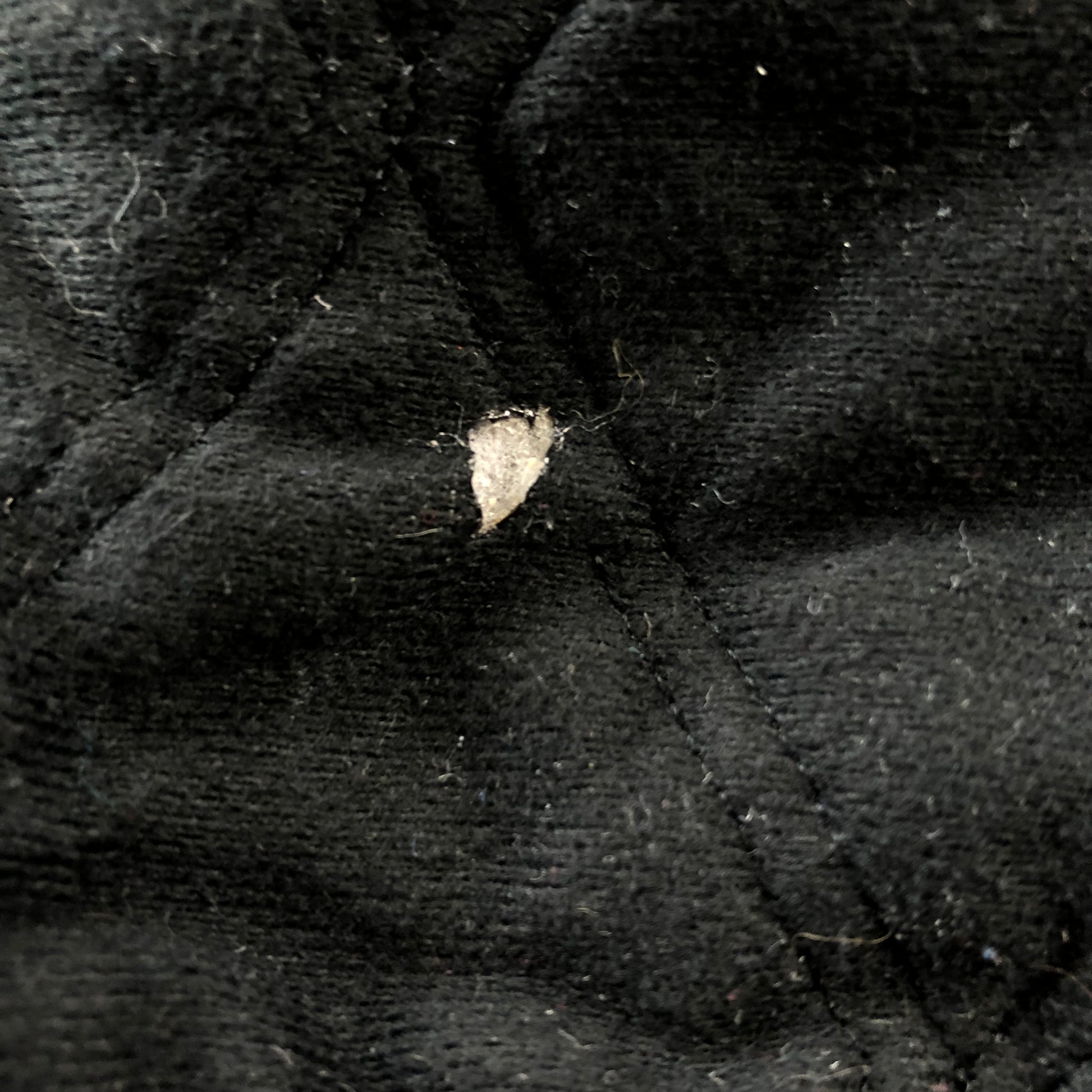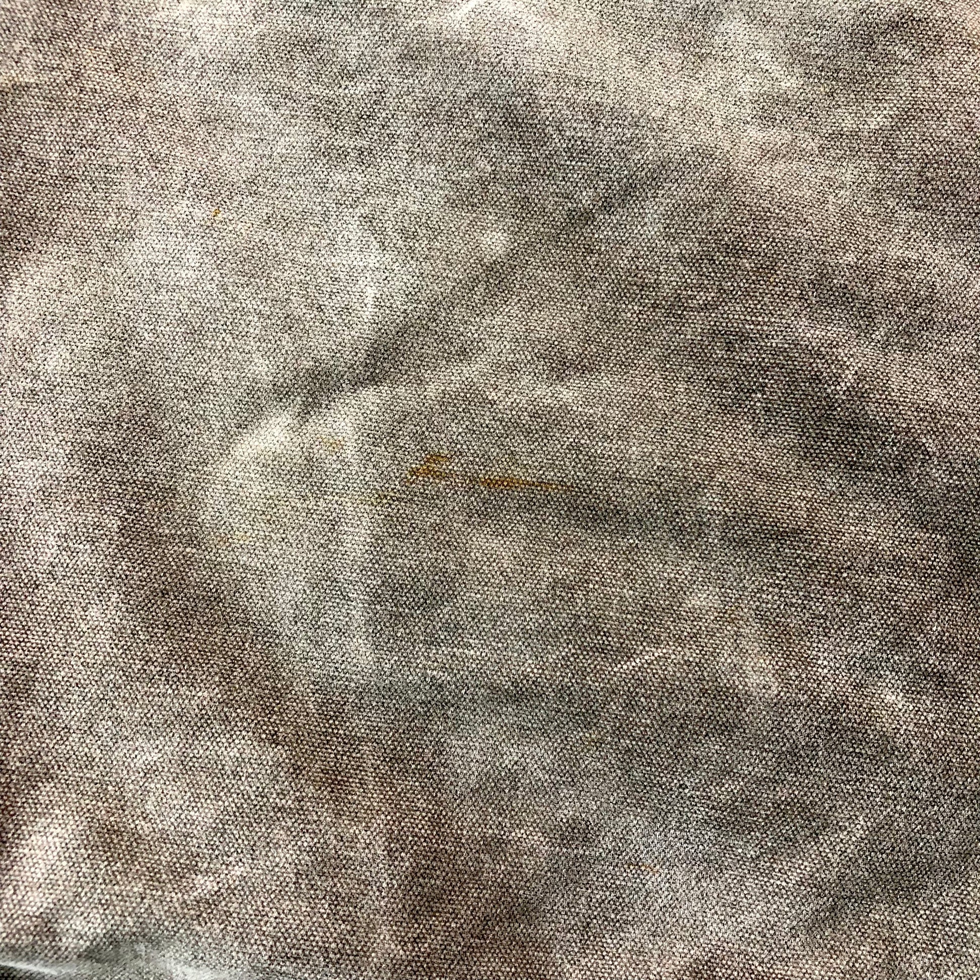 Condition: Small red paint stains on front side. Light stain on front side and back side. Small rip on the inside lining fabric. Zipper pull tab missing, zipper still functional. Used in worn condition.