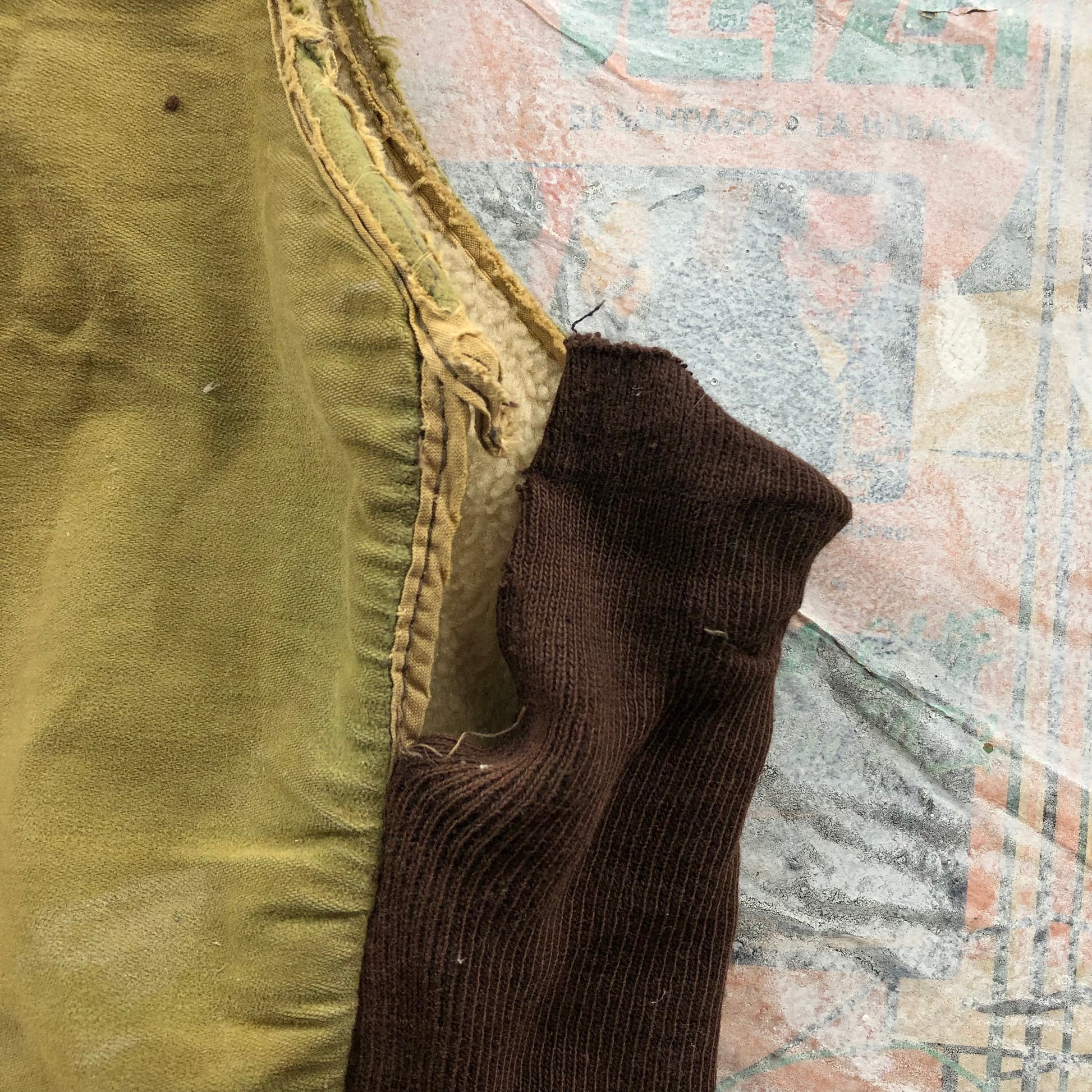 Condition: Sun faded. Distressed on the inseams all around. Small hole on front side. Bit of unstitching in material under right side armpit. No zipper or buttons for enclosure. Used in worn condition.