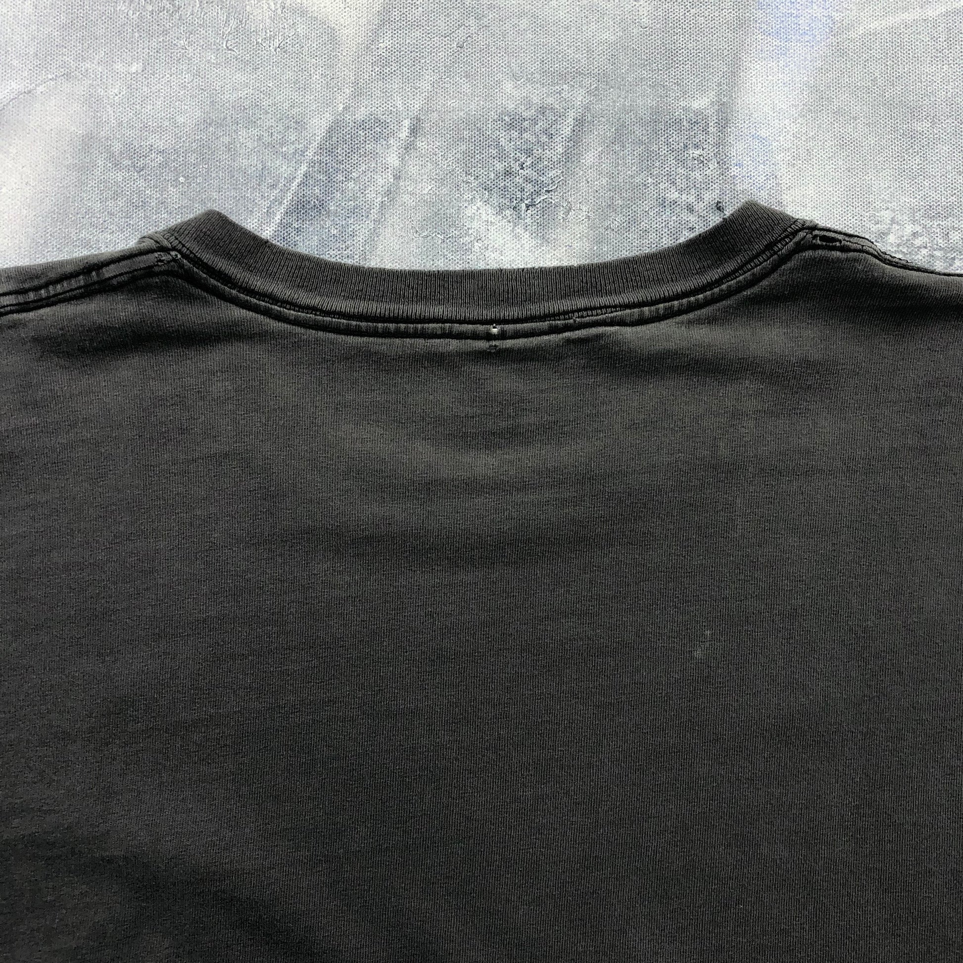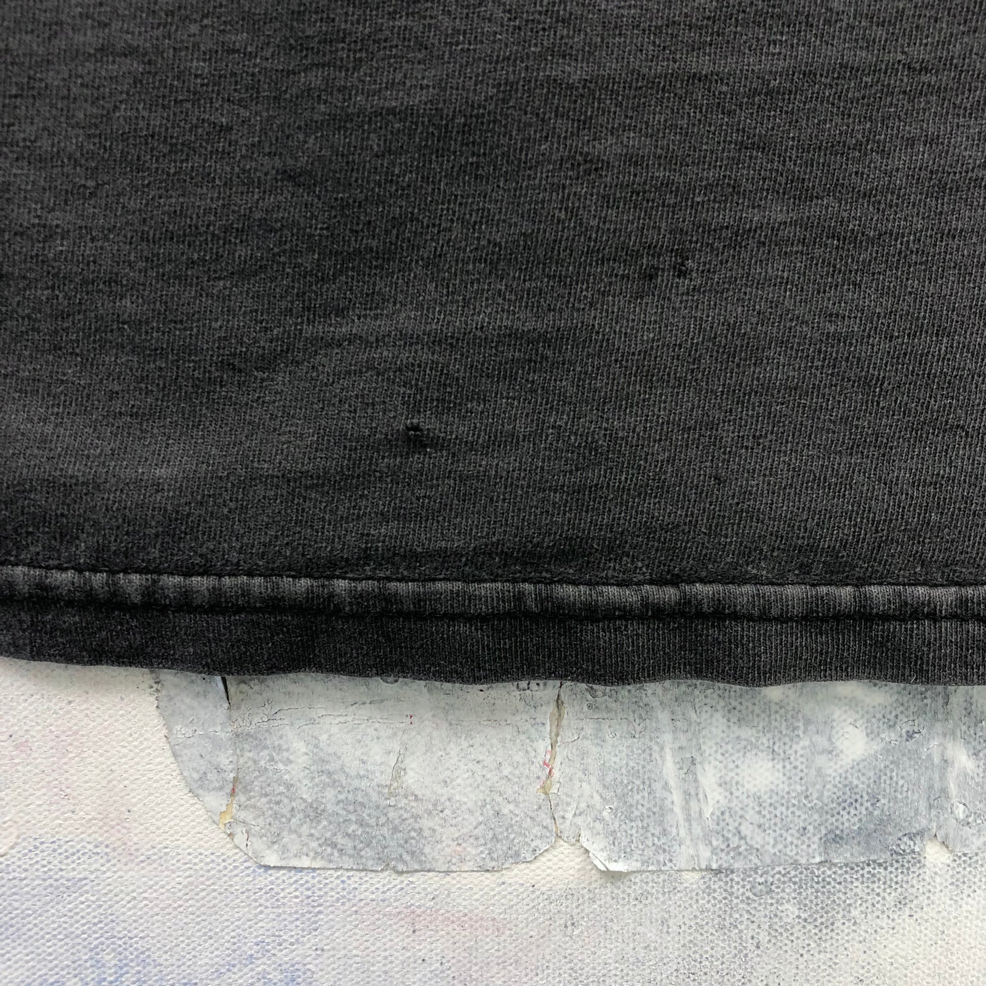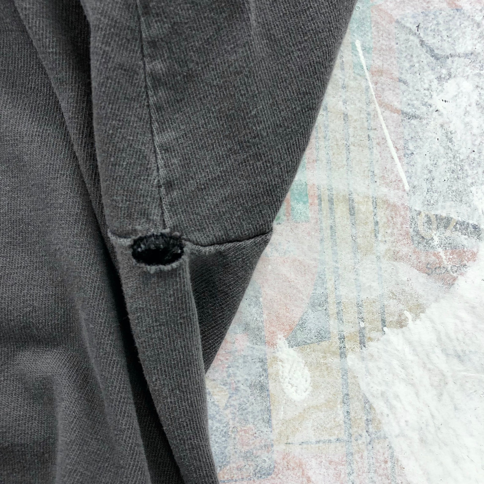 Condition: Some holes on front side through logo. Hole under armpits. Small holes on back side. Faded, used in worn condition.