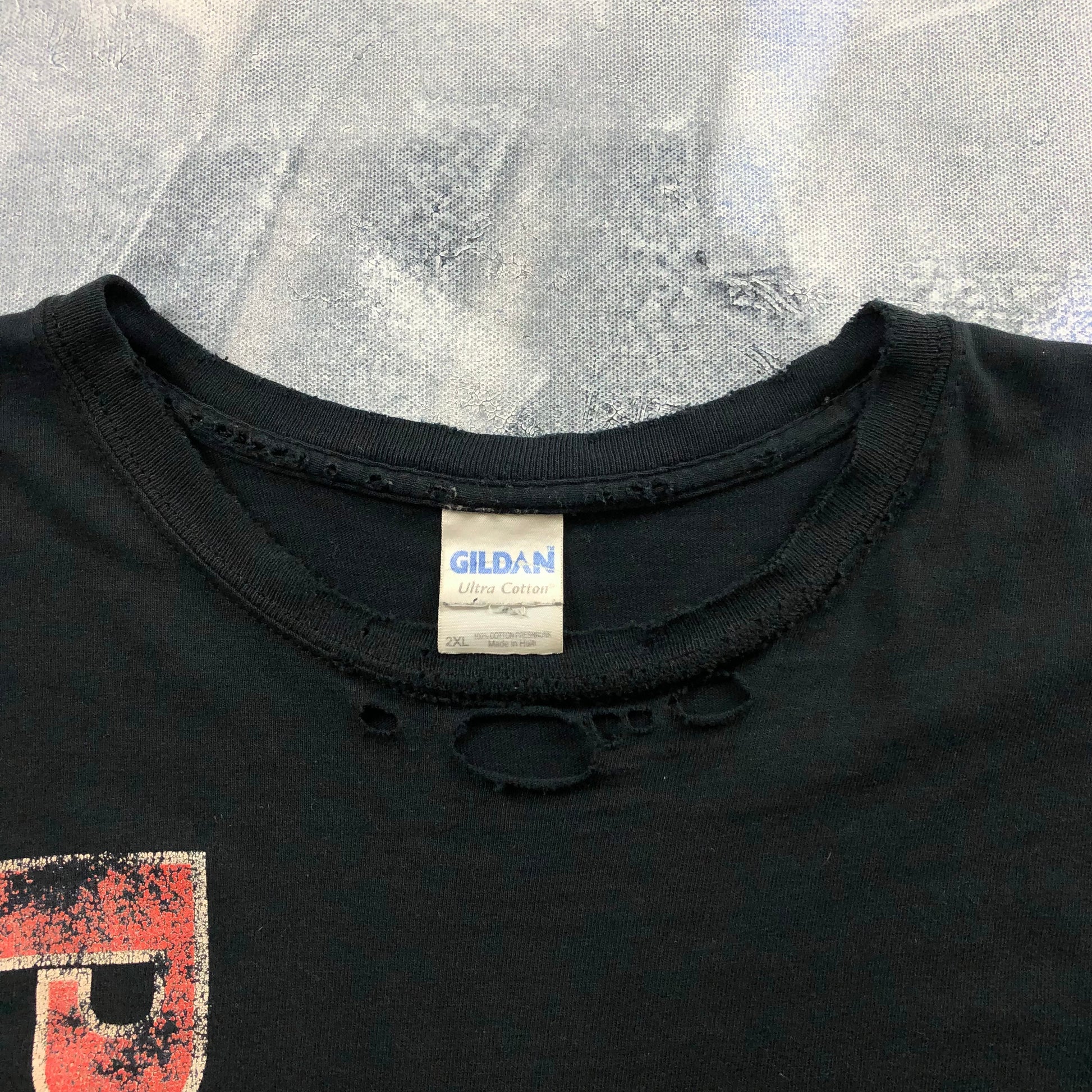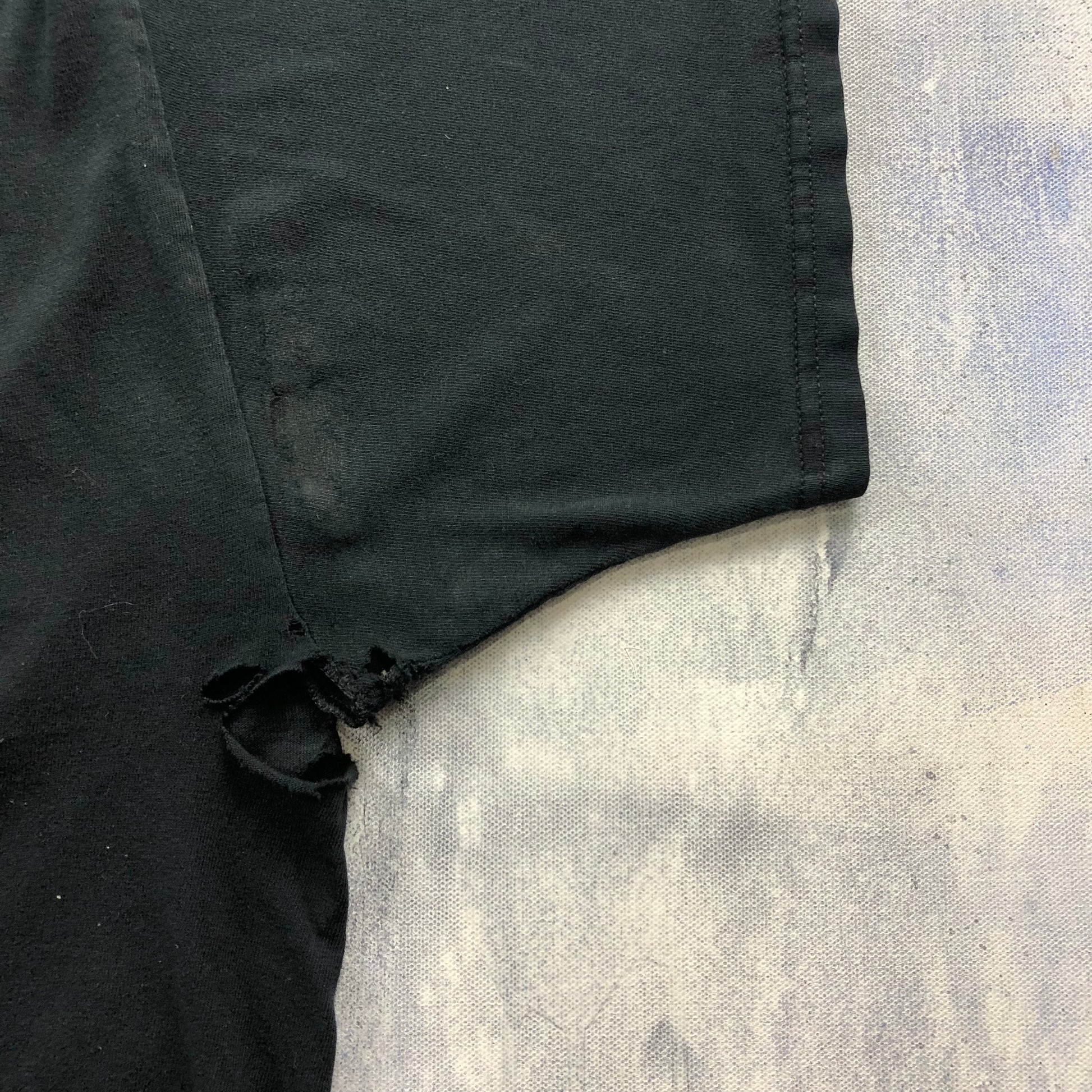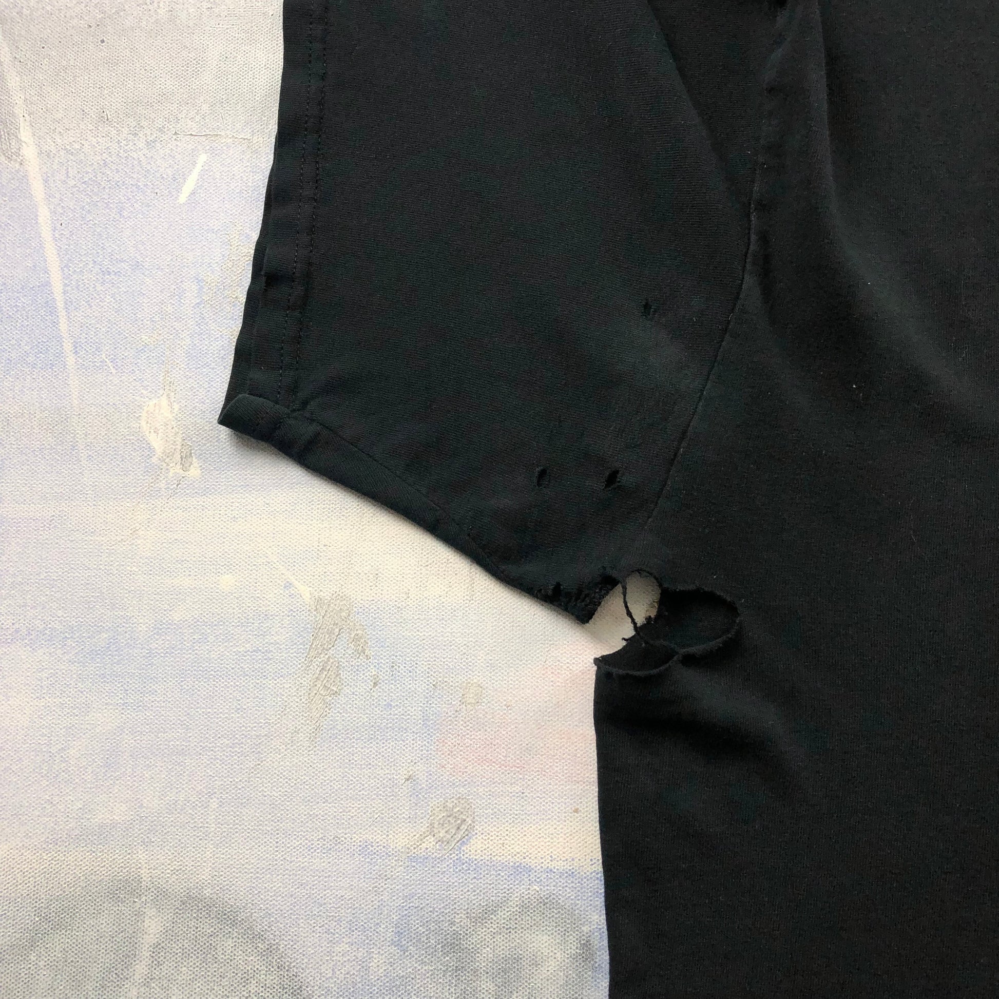 Condition: Distressed with holes around collar and armpits. Few small holes on front side. Faded, used in worn condition.