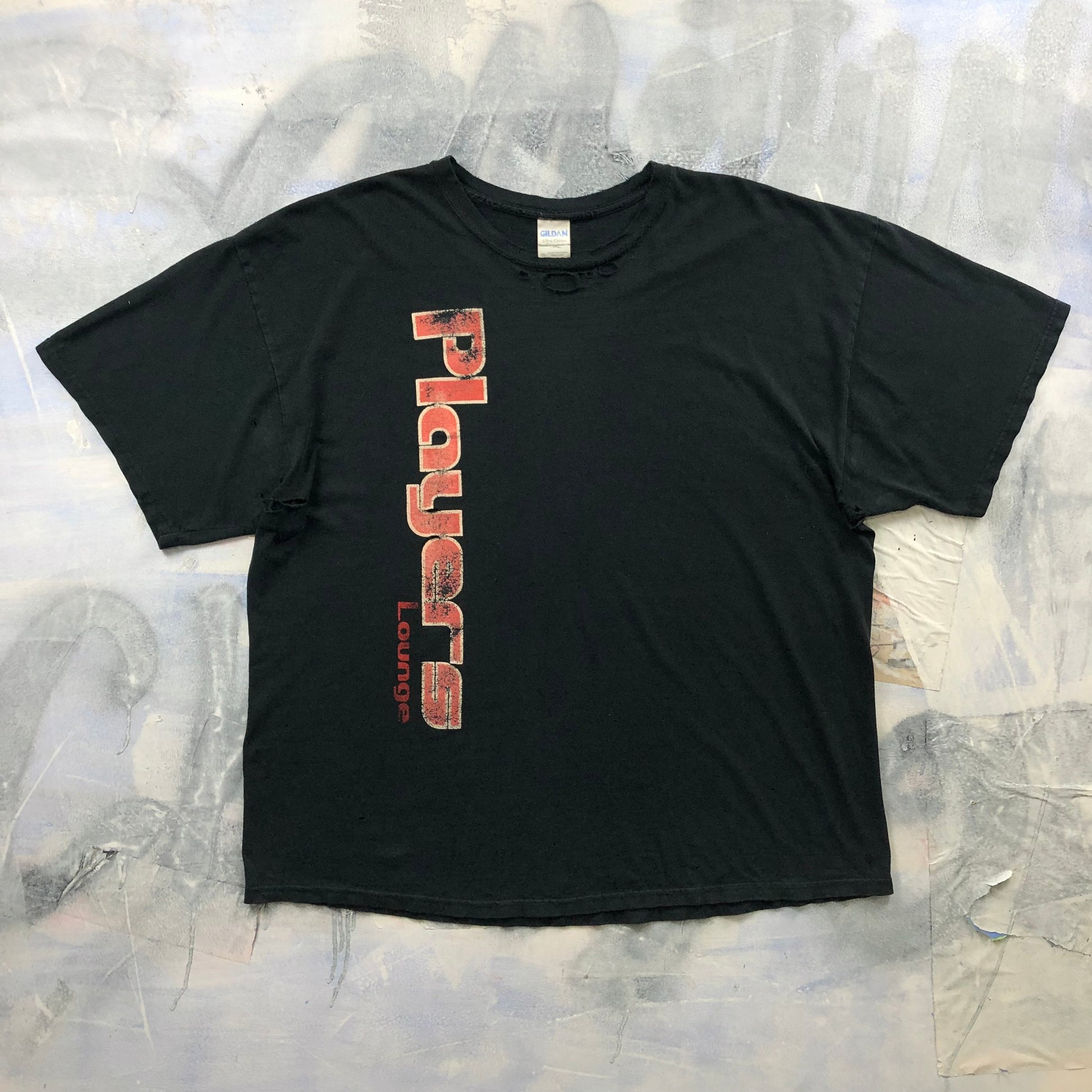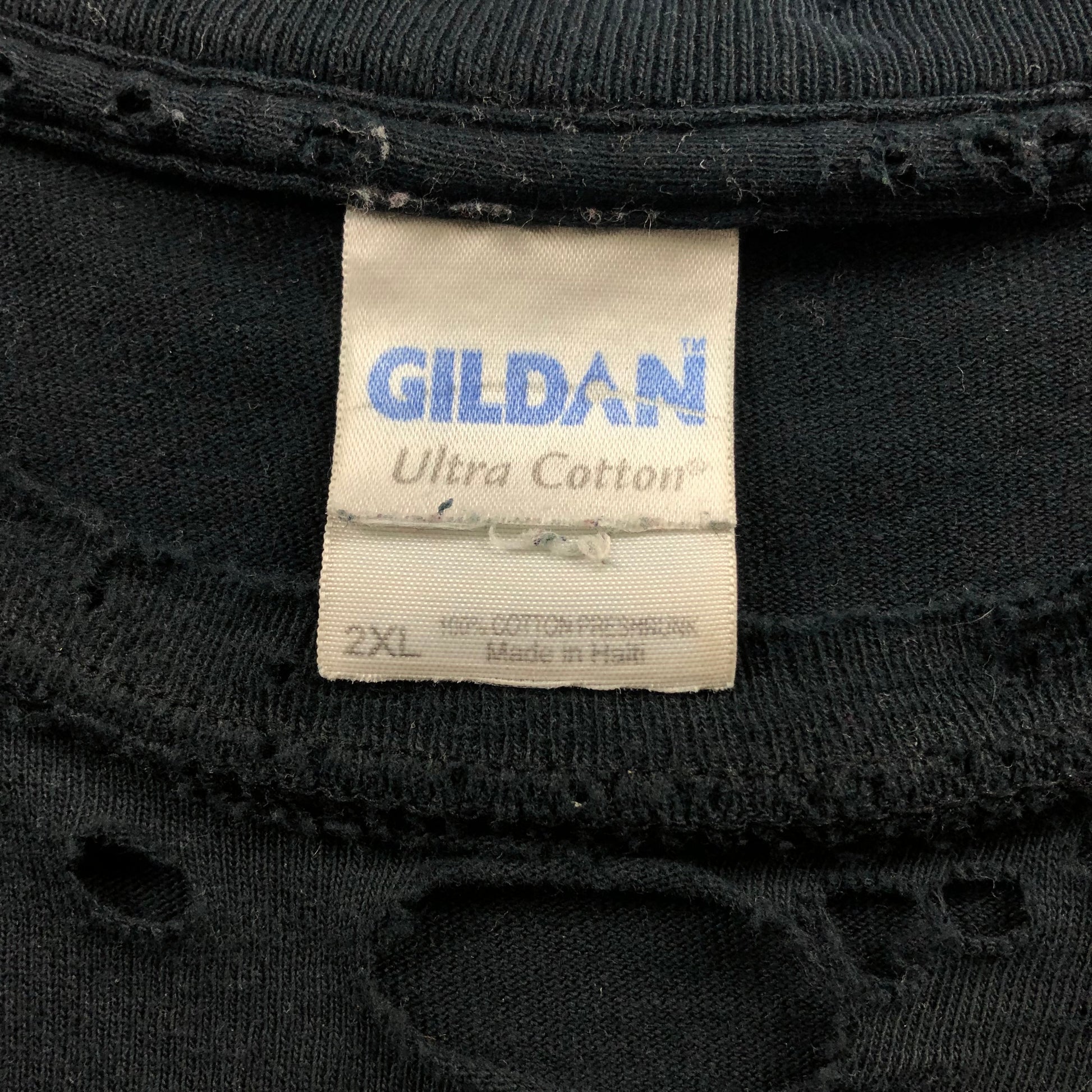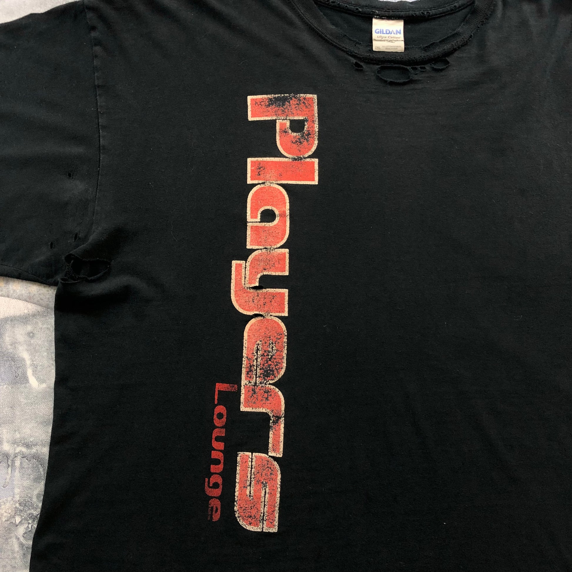 Condition: Distressed with holes around collar and armpits. Few small holes on front side. Faded, used in worn condition.