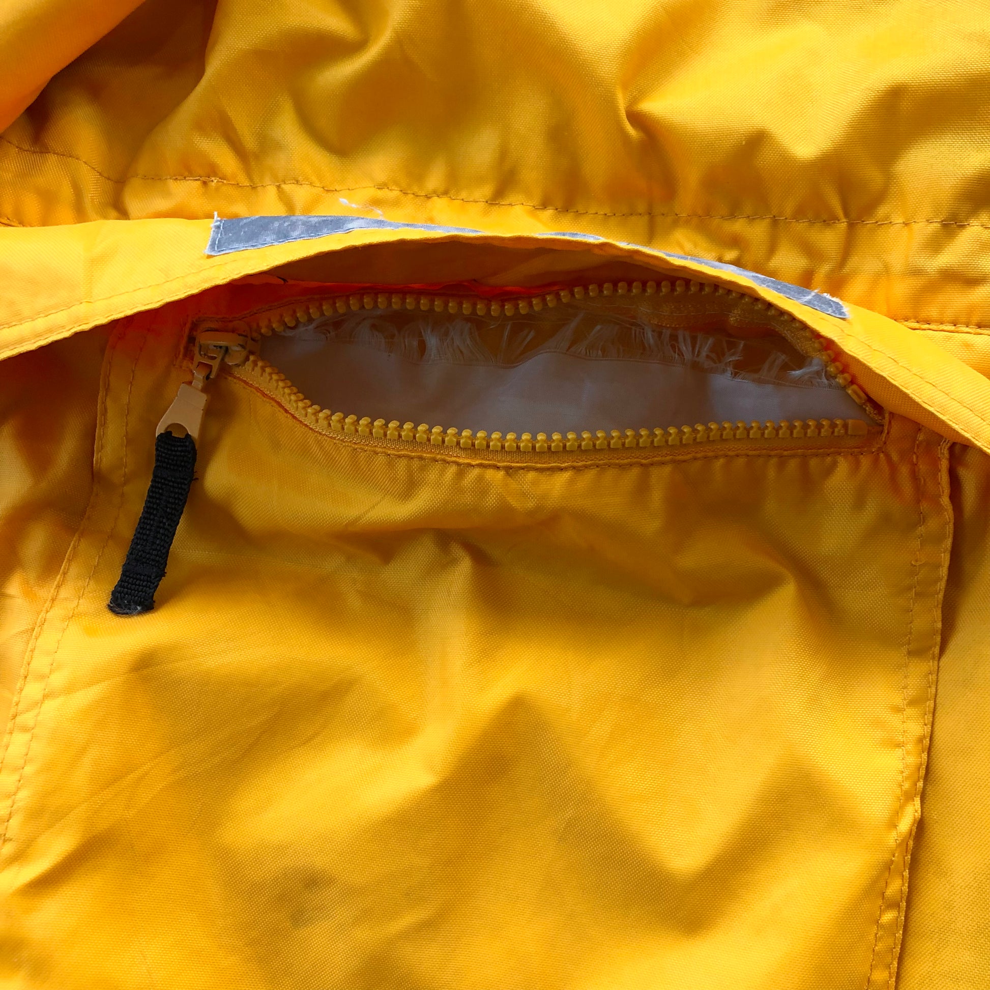 Condition: Inner lining of right side pocket unstitched. Zipper pull tab on left side front pocket detached. Front zipper pull tab missing. Has extra front zipper underneath, both zippers functional. Missing zip good. Used in worn condition.