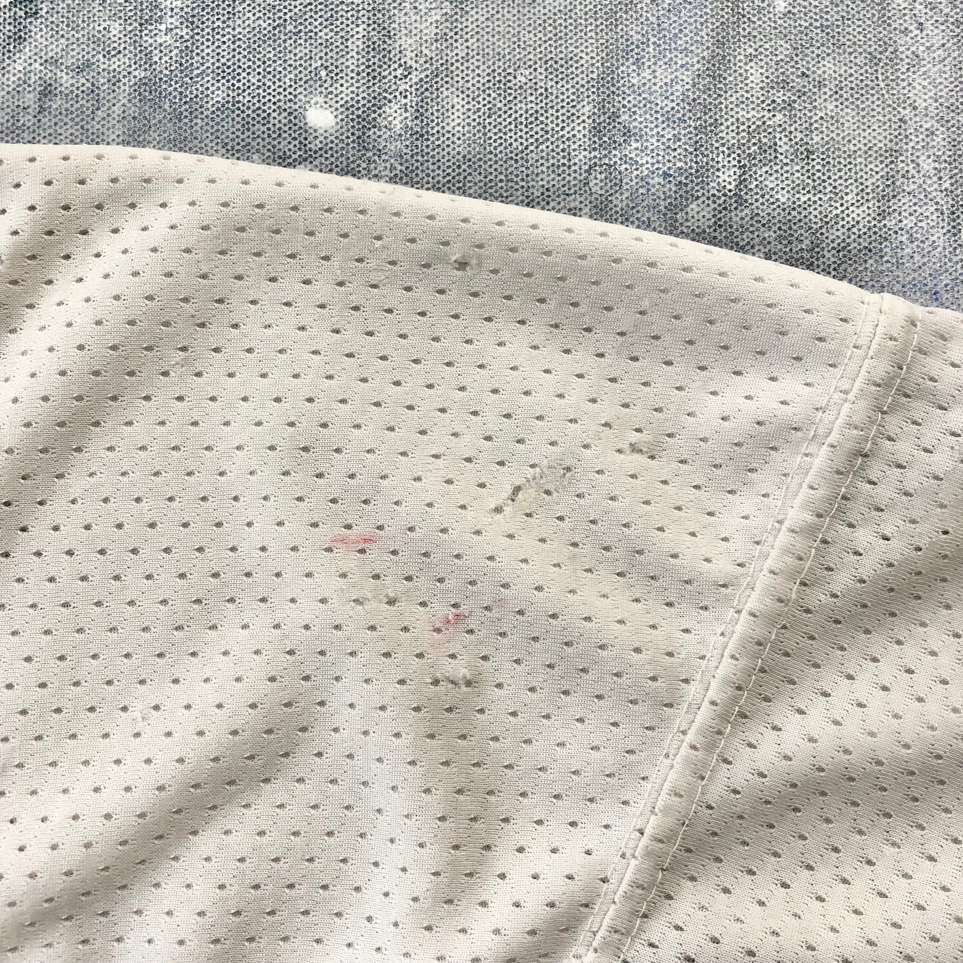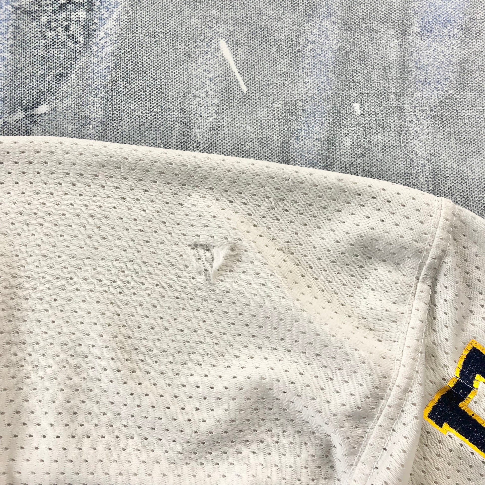 Condition: Small light stains and scuff on top right shoulder. Small holes on top left shoulder. Used in worn condition.