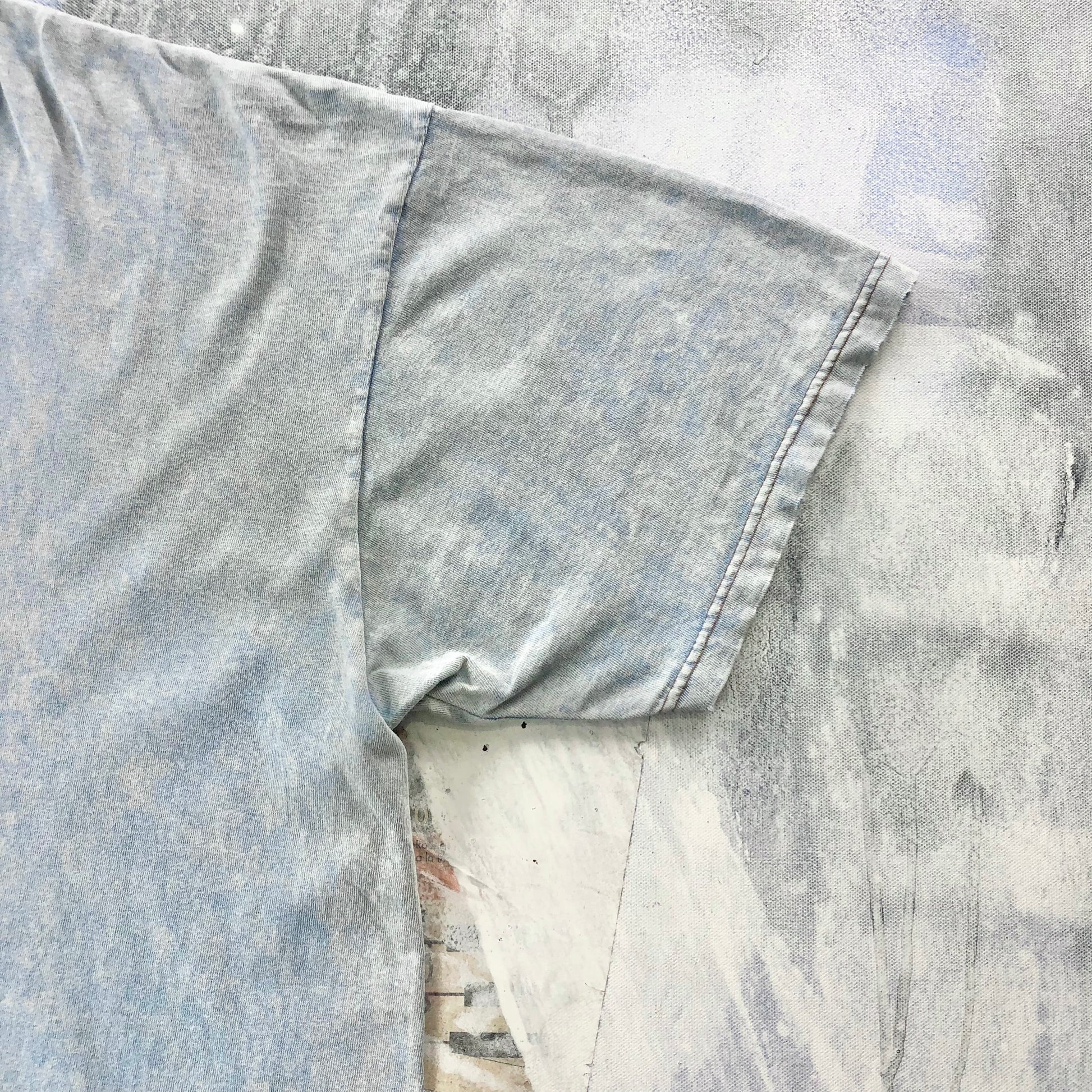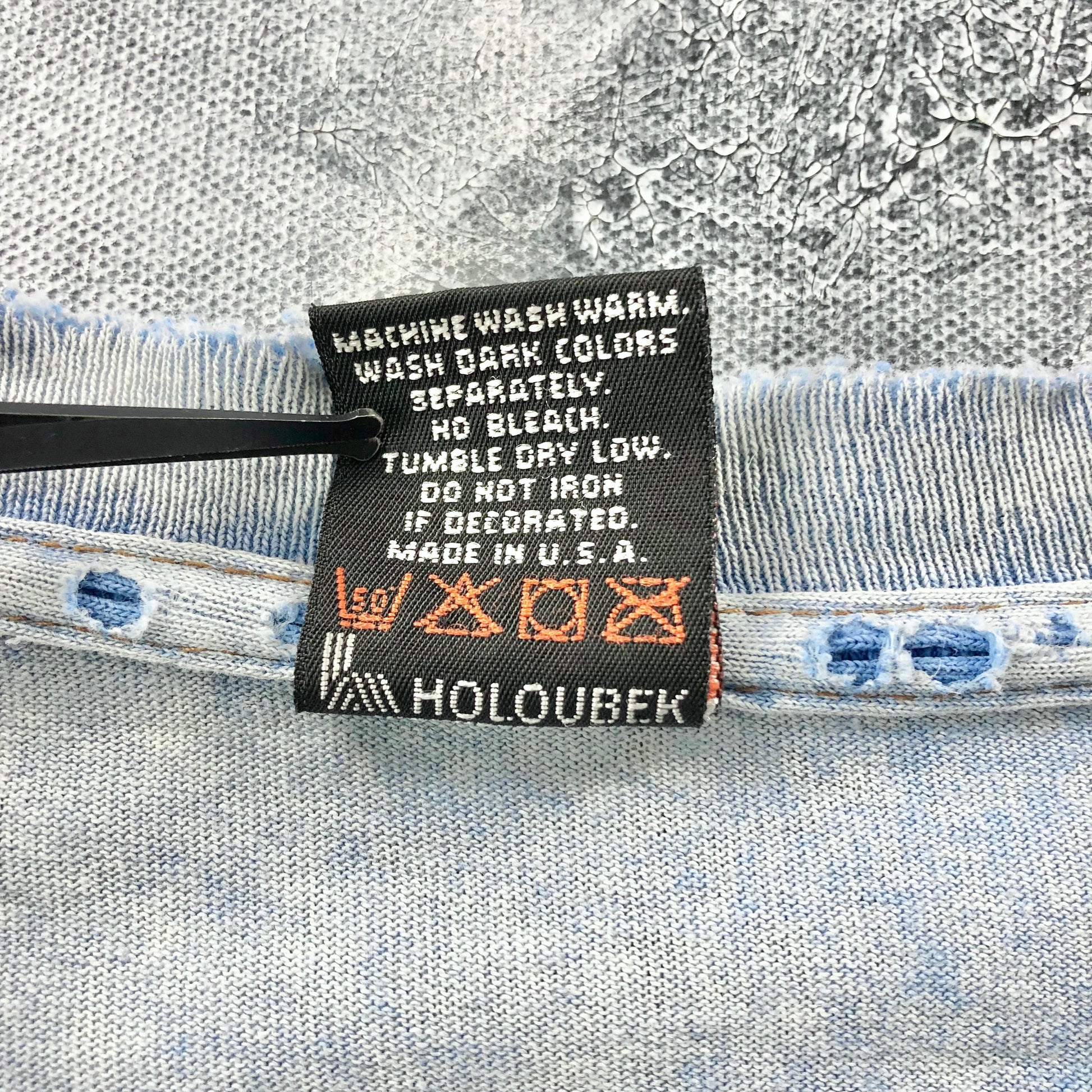 Condition: Light stains around armpits. Few small holes on front side. Distressed on the collar. Used in worn condition.