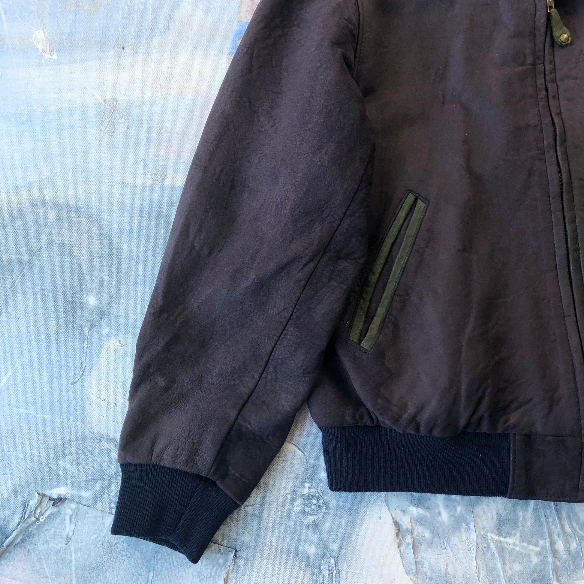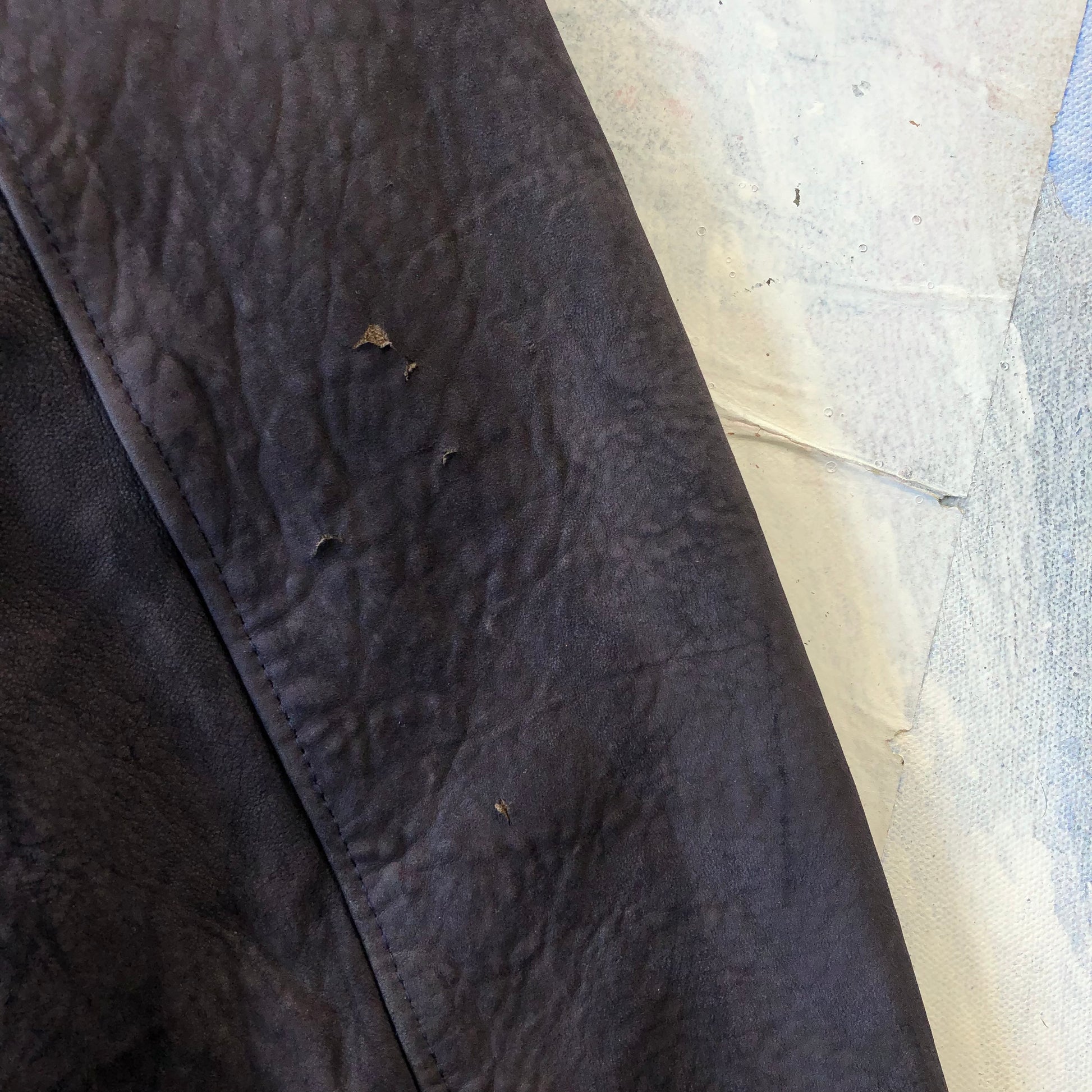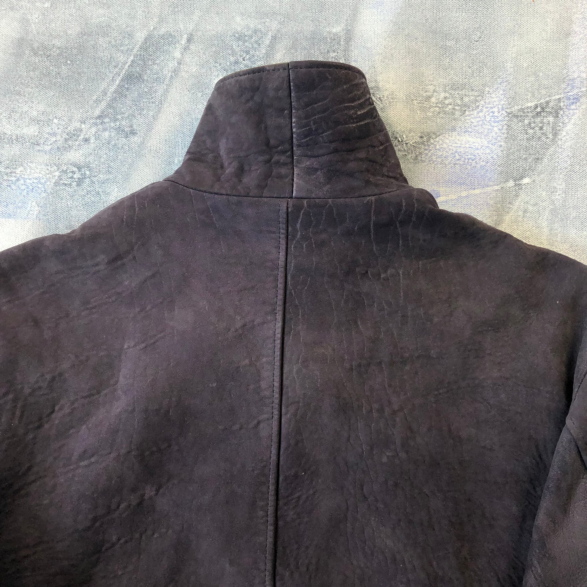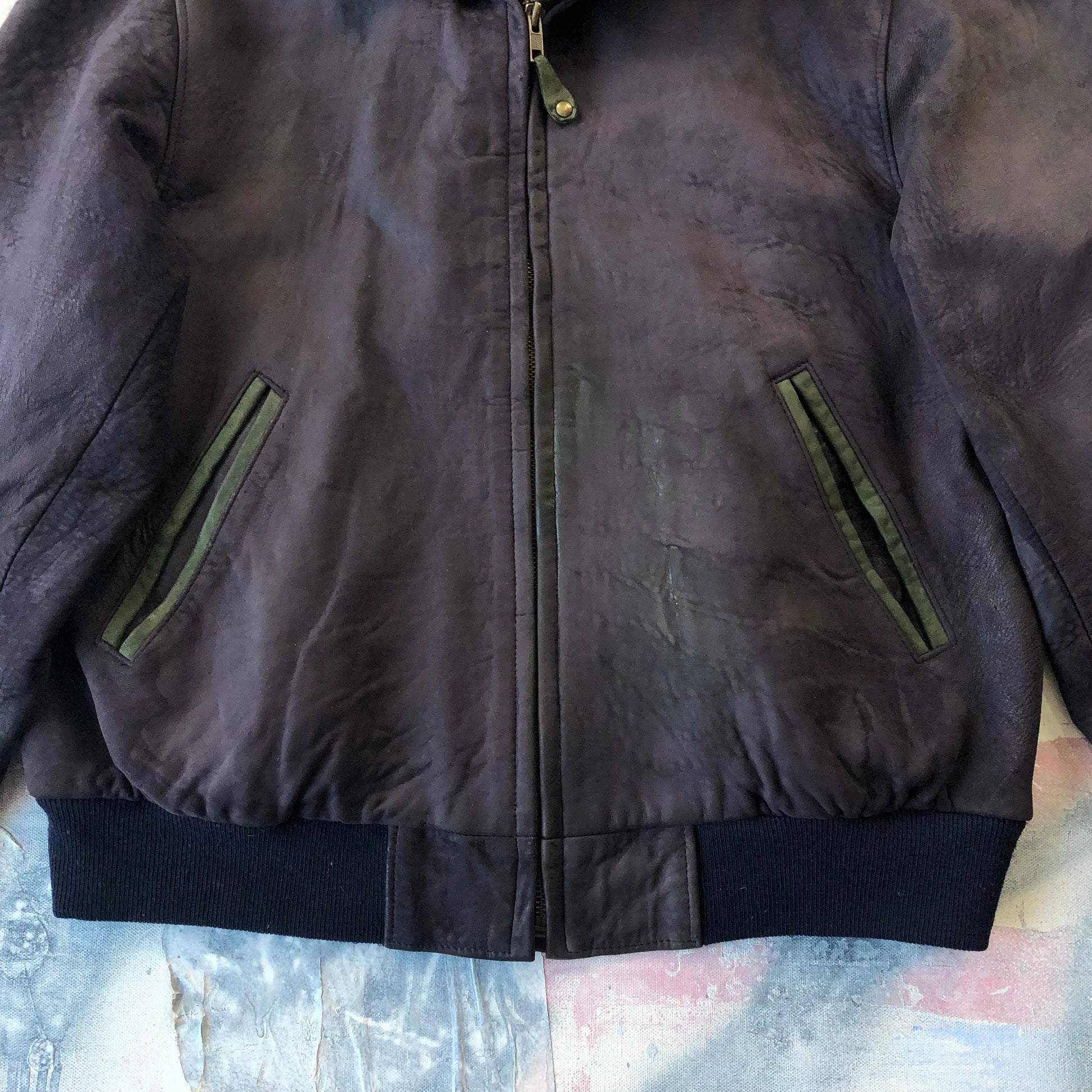Condition: Suede leather patina. Some light staining on front side and back.  Few small scuffs on right sleeve. Used in worn condition.