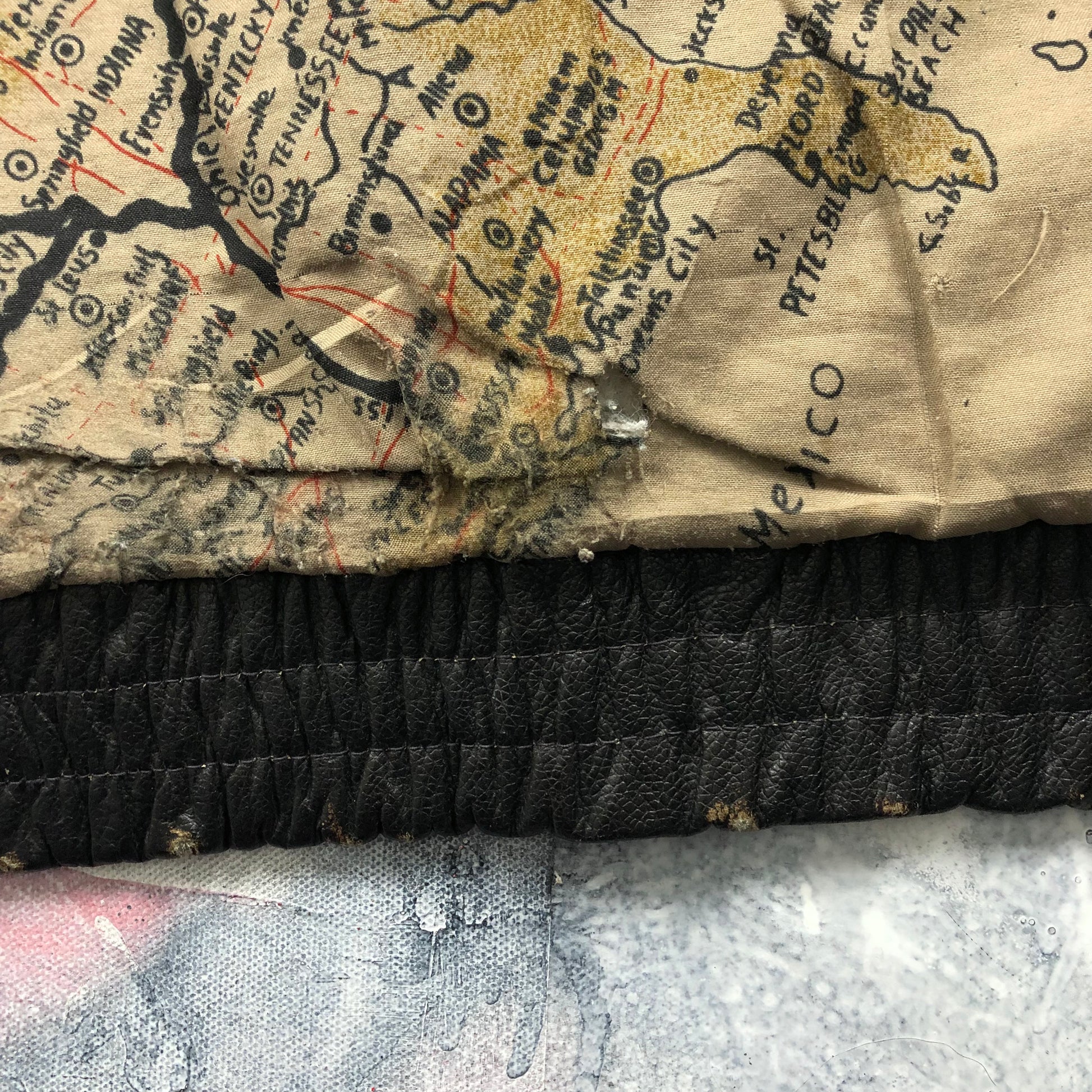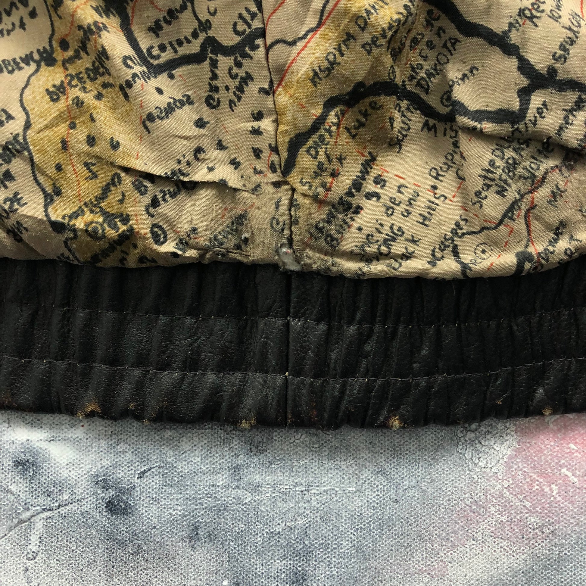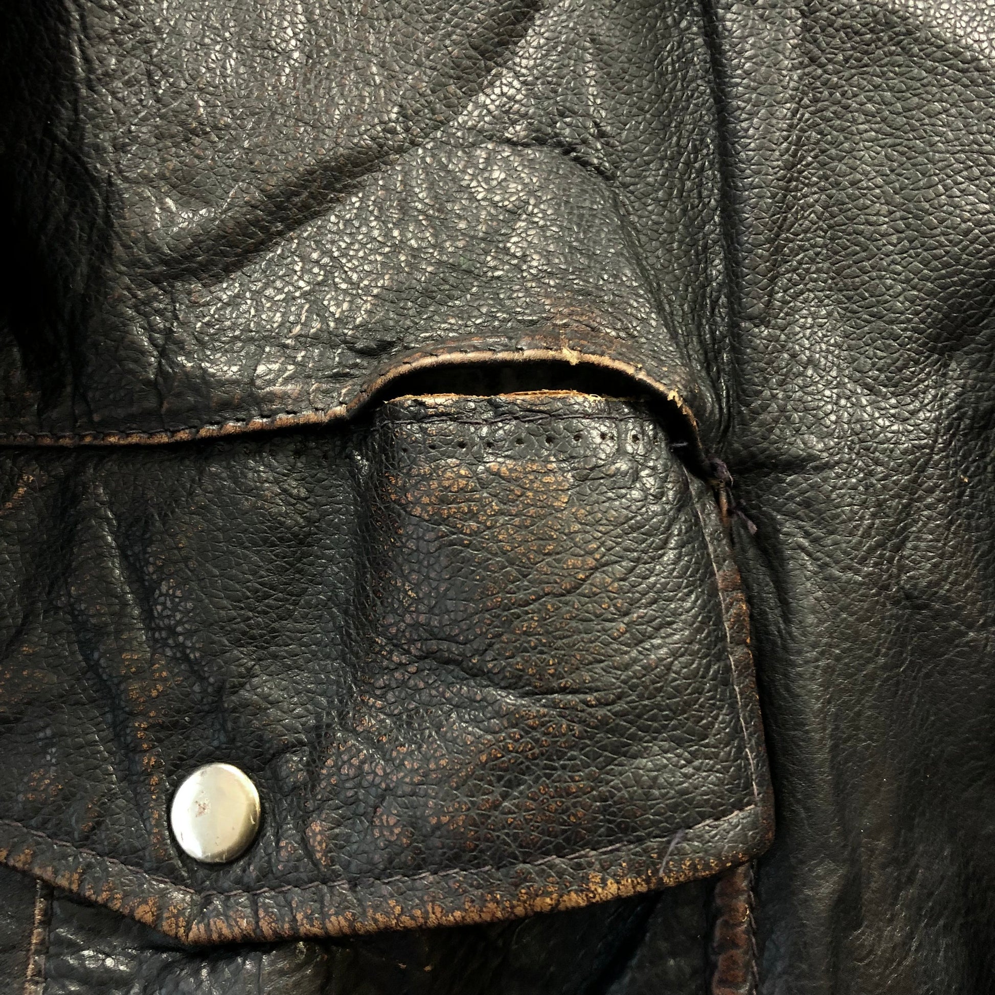 Condition: Small hole on front left pocket. Zipper pull tab replaced. Small unstitching on front right side pocket flap. Some unstitching on interior sleeve zipper hemline. Couple small scuffs/holes on interior lining. Leather patina fading. Used in worn condition.